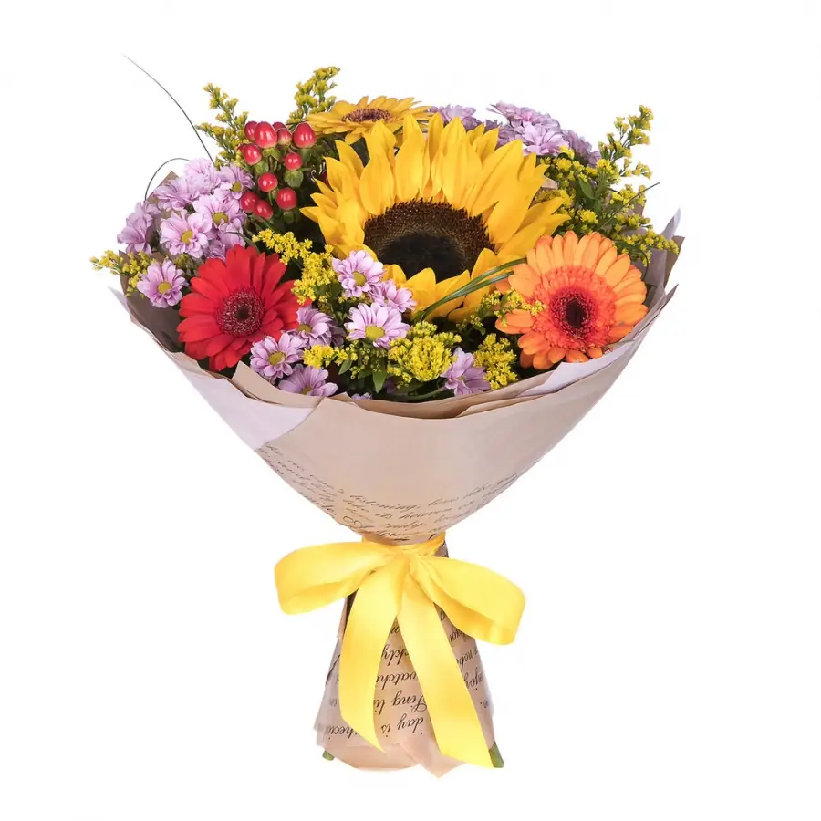 Небольшой, очень открытый, солнечный букет с подсолнухом и герберами создает счастливую атмосферу вокруг себя. Такой подарок невероятно порадует личность положительную со всех сторон, жизнерадостную и обладающую хорошим чувством юмора.