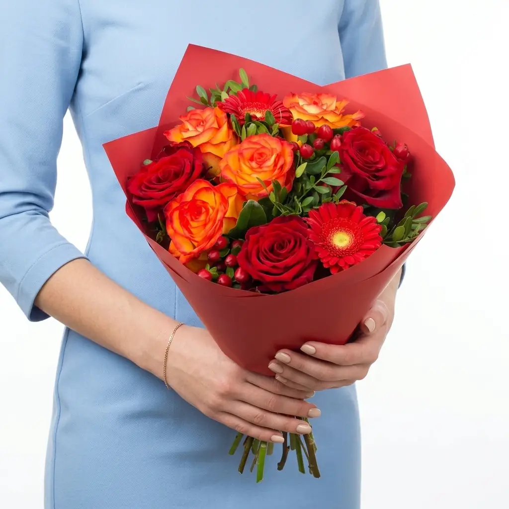 Если пришла пора поздравить этого человека, хорошим выбором может стать букет в красно-оранжевых тонах под названием "Восторг".