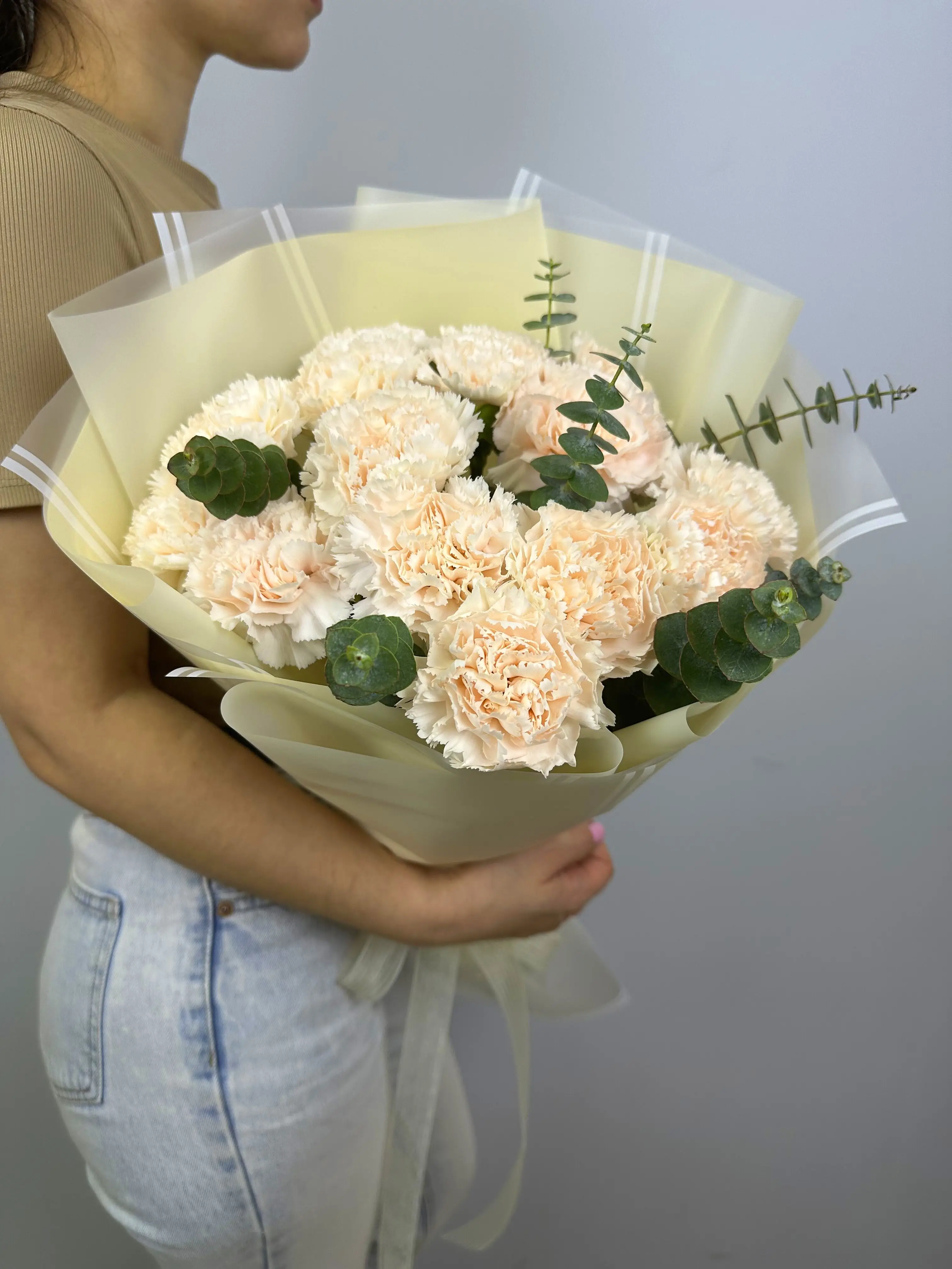 Букет гвоздик с эвкалиптом в дизайнерской упаковке