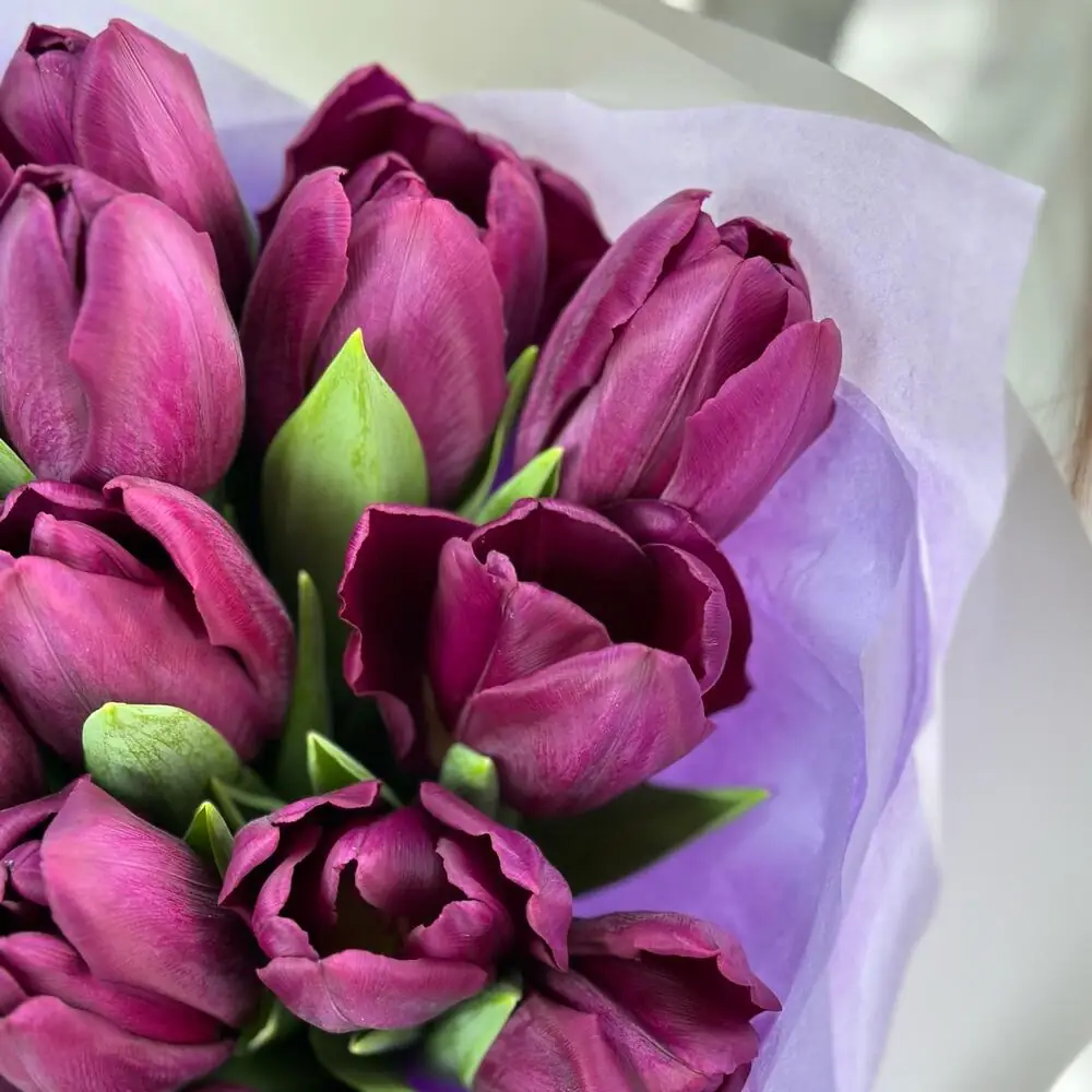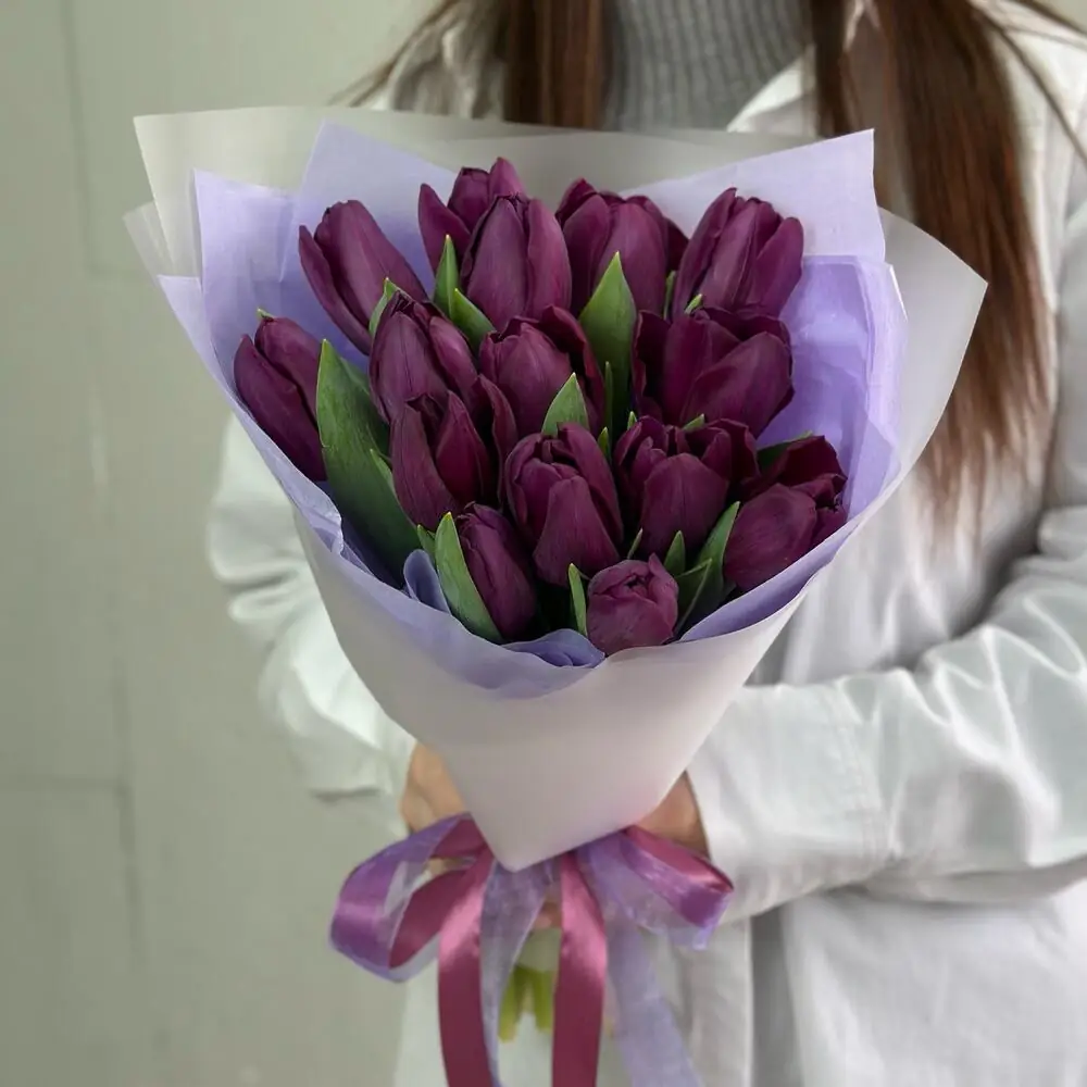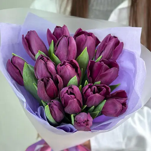 15 Сиреневых тюльпанов в нежной упаковке — купить по цене от 4250 руб. с доставкой в Нижнем Новгороде