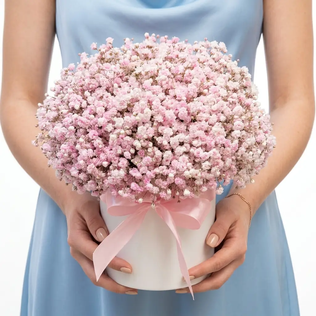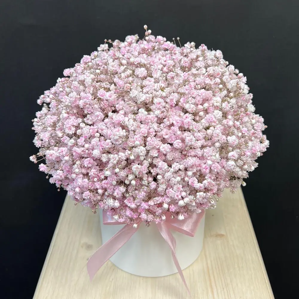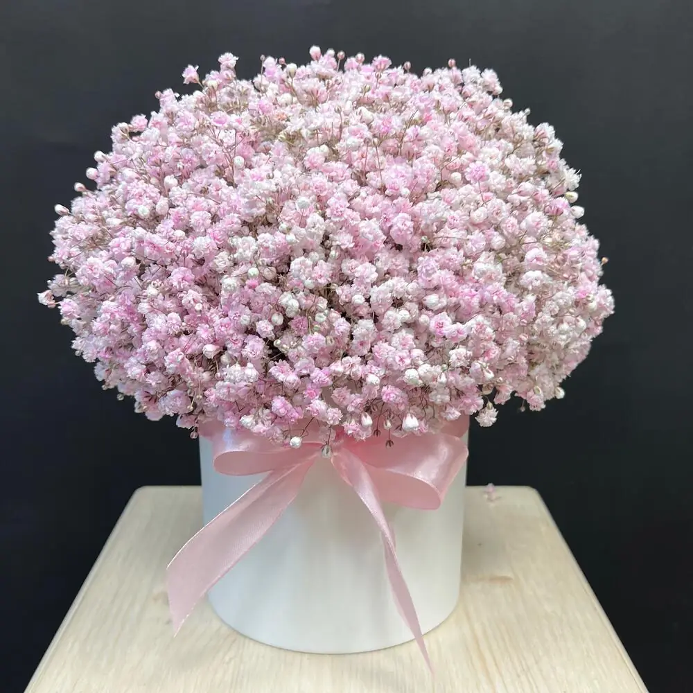 Нежная розовая гипсофила в шляпной коробке — купить по цене от 5590 руб. с доставкой в Нижнем Новгороде