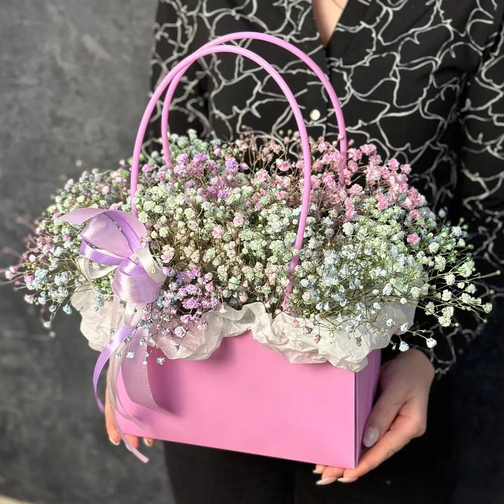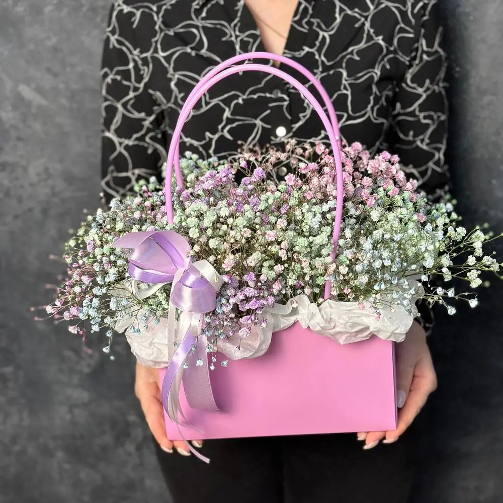 Разноцветная гипсофила в розовой сумке — купить по цене от 3620 руб. с доставкой в Нижнем Новгороде