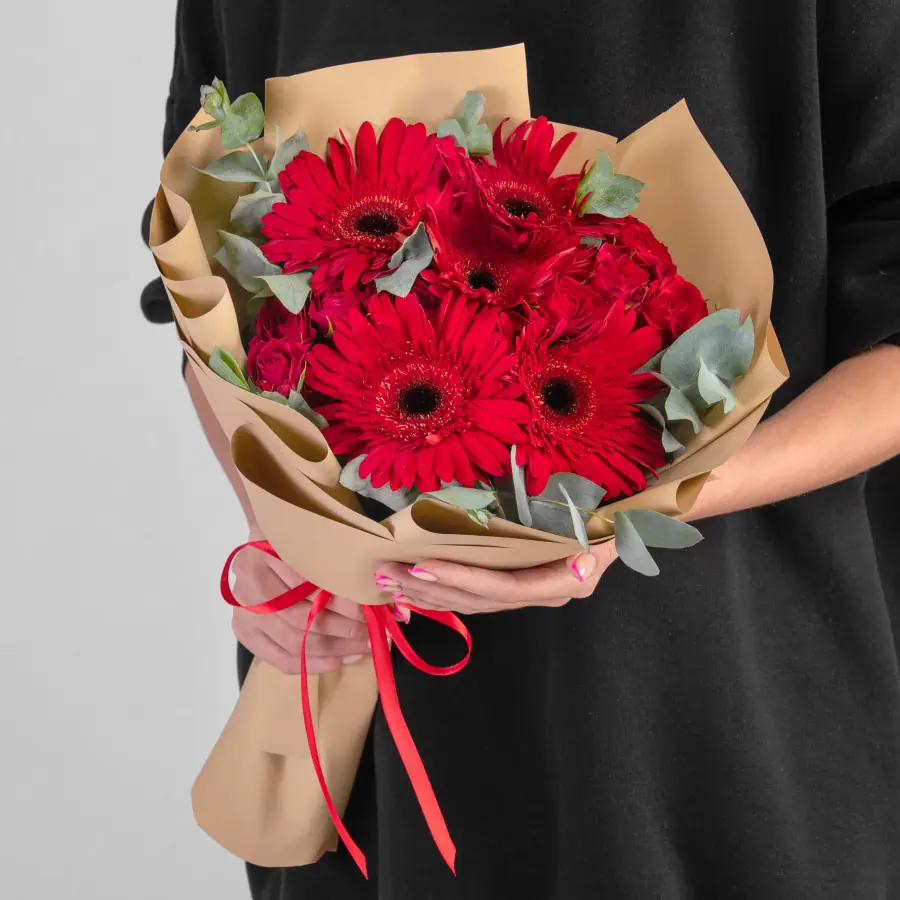 Букет из красных гербер и кустовой розы — купить по цене от 3600 руб. с доставкой в Нижнем Новгороде