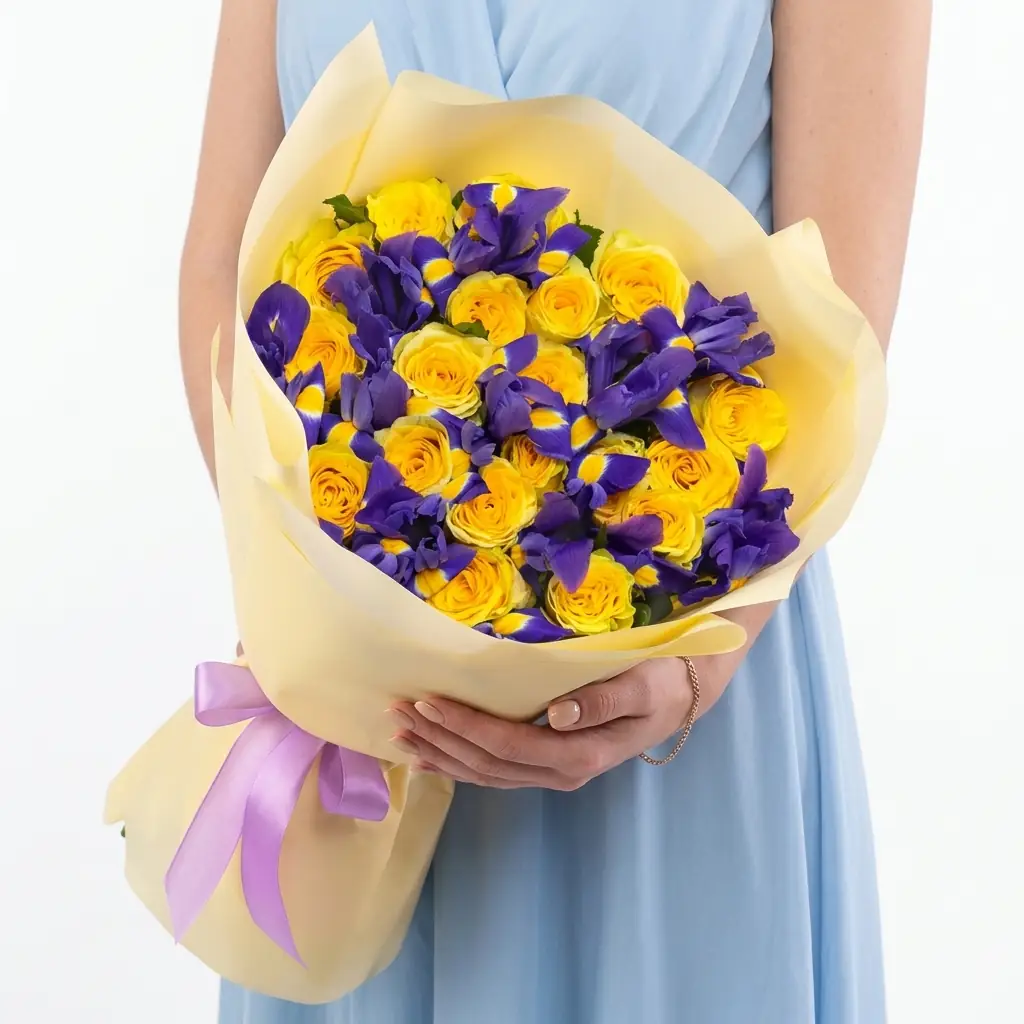 Букет с желтыми розами и ирисами — купить по цене от 4771 руб. с доставкой в Нижнем Новгороде