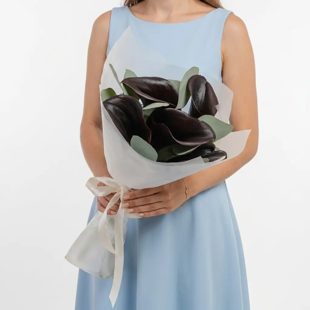 На фото - Чёрный букет с эвкалиптом. В составе данной композиции: Калла - 5 шт, Зелень, Дизайнерская упаковка, Лента атласная, . На сайте sbuket-nn.ru Вы найдете большой выбор недорогих букетов, цветочных композиций для любого повода. У нас можно заказать Чёрный букет с эвкалиптом за 3700 руб.