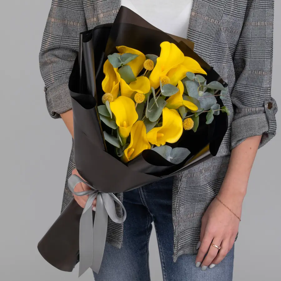 На фото - Жёлтый букет в чёрной упаковке . В составе данной композиции: Калла - 9 шт, Краспедия - 5 шт, Зелень, Дизайнерская упаковка, Лента атласная, . На сайте sbuket-nn.ru Вы найдете большой выбор недорогих букетов, цветочных композиций для любого повода. У нас можно заказать Жёлтый букет в чёрной упаковке за 6490 руб.