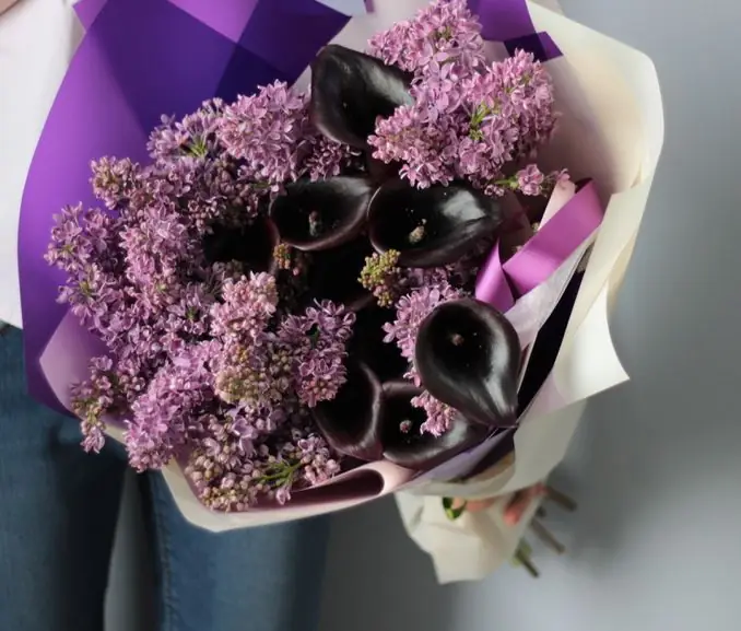 Композиция с черными каллами и сиренью — купить по цене от 11490 руб. с доставкой в Нижнем Новгороде