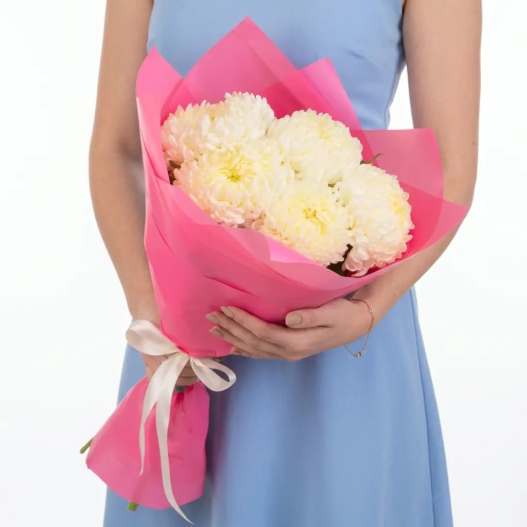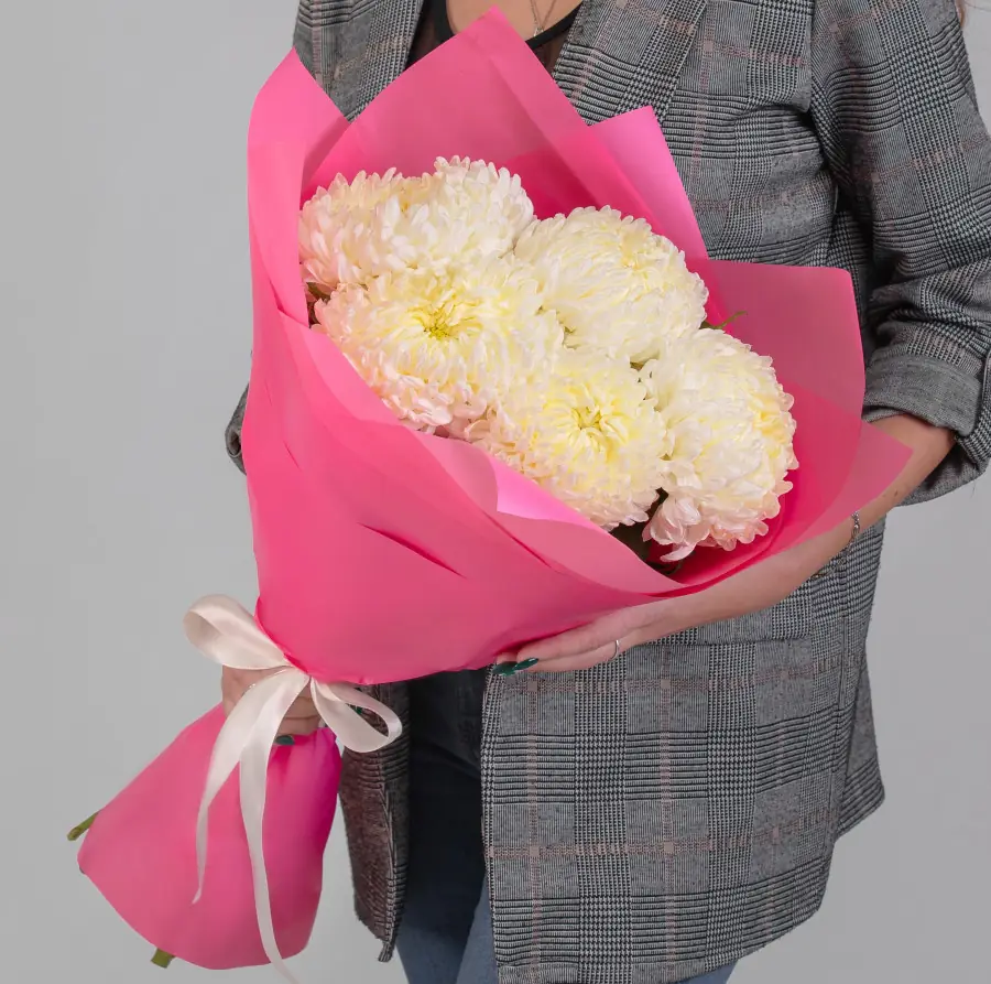 Кремовые Хризантемы в Розовой упаковке — купить по цене от 3100 руб. с доставкой в Нижнем Новгороде