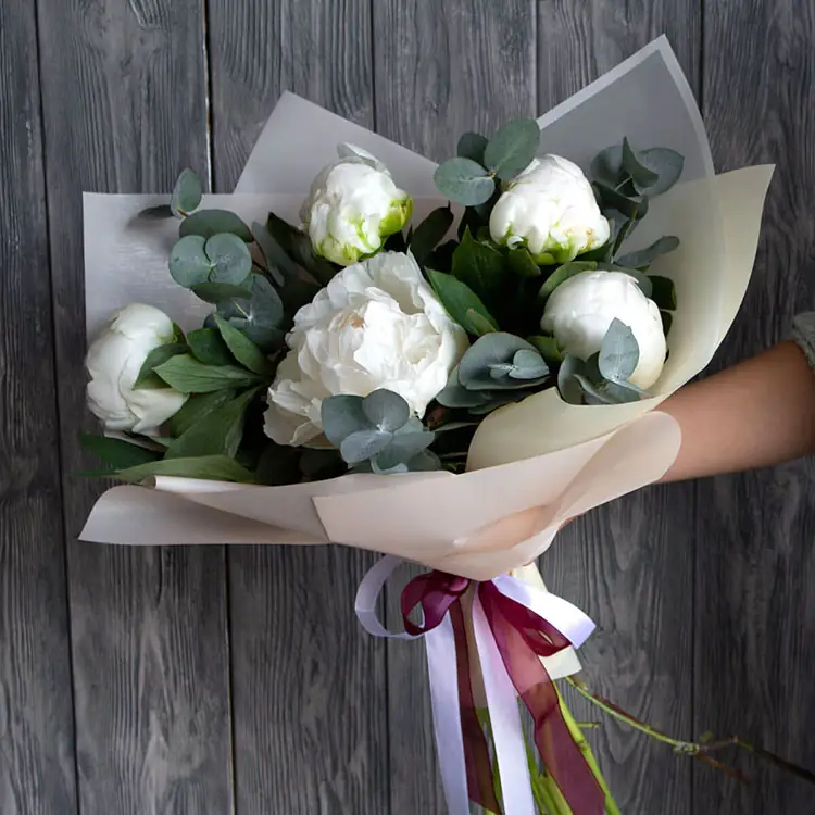 5 Белых Пионов с эвкалиптом — купить по цене от 3600 руб. с доставкой в Нижнем Новгороде