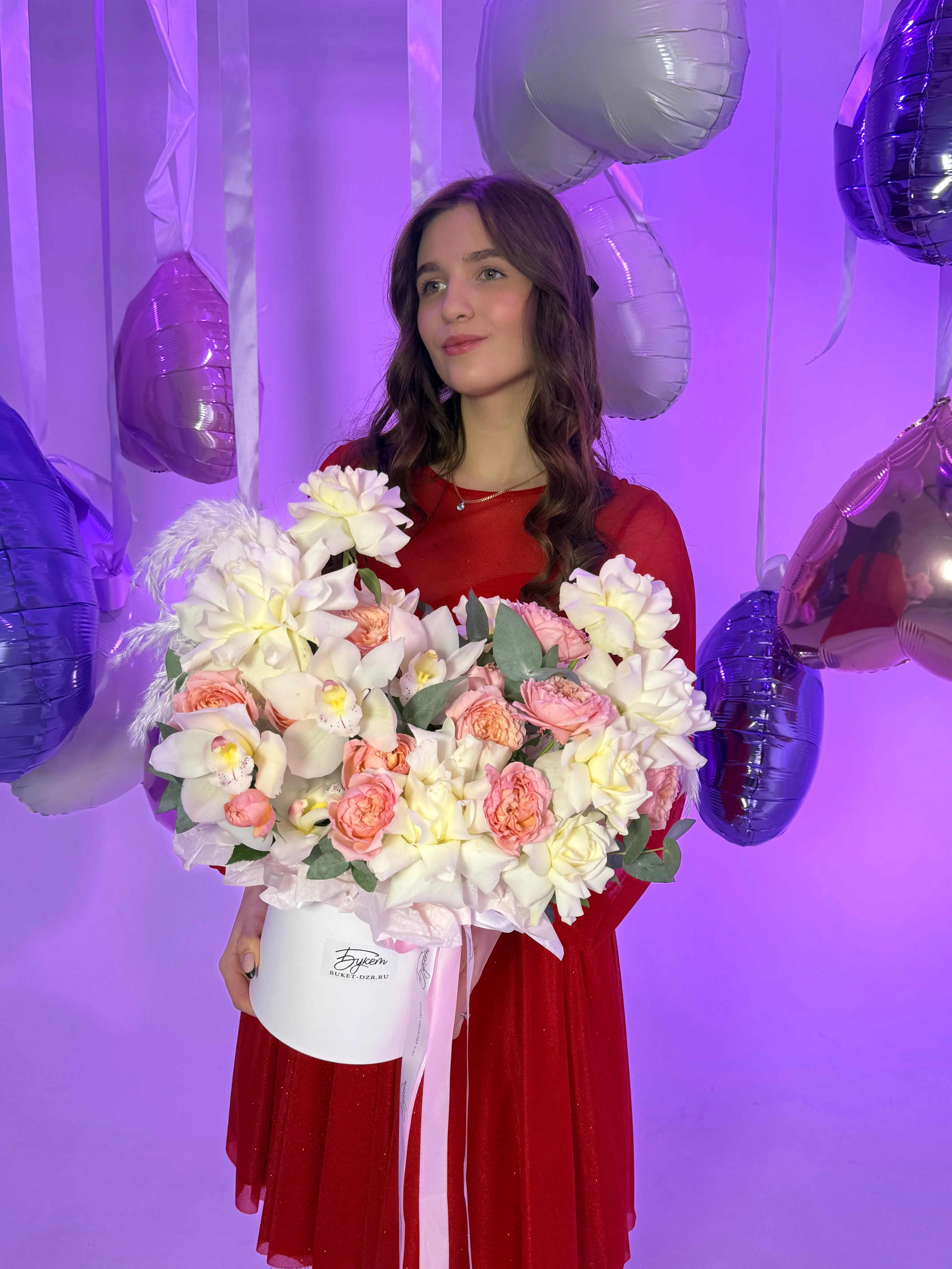 На фото - Нежная композиция с орхидеями и розами . В составе данной композиции: Роза Эквадор - 3 шт, Кенийская роза - 10 шт, Роза белая кустовая пионовидная - 4 шт, Орхидея - 4 шт, Зелень, Коробка, Флористическая губка, Лента атласная. На сайте "Букет-НН" Вы найдете большой выбор недорогих букетов, цветочных композиций для любого повода. У нас можно заказать Нежная композиция с орхидеями и розами за 7200 руб.