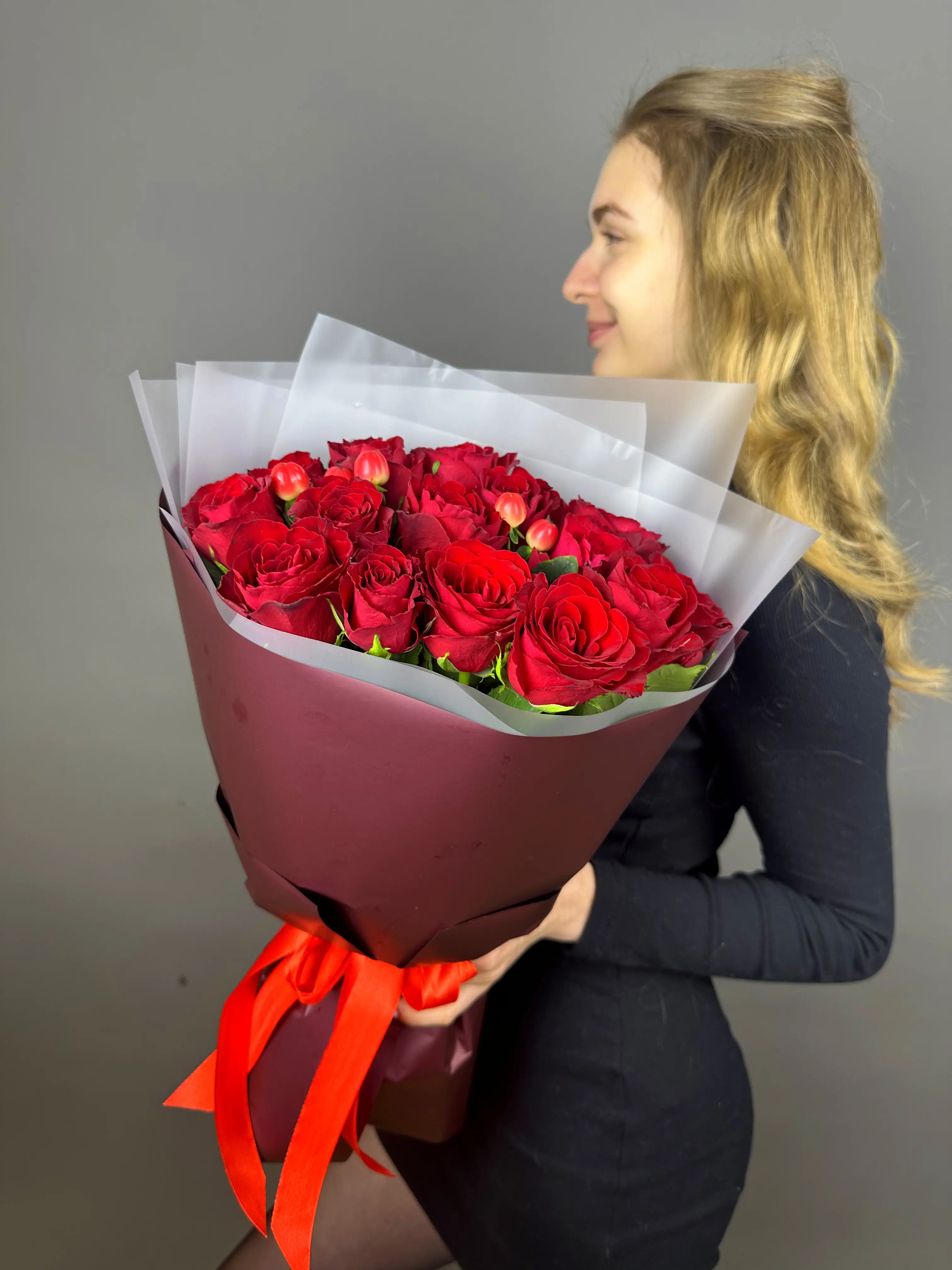 Этот великолепный букет представляет собой изумительное сочетание королевских роз и декоративного гиперикума. Розы, являясь символом любви и страсти, привносят в композицию элегантность и утонченность. Гиперикум, известный своим ярким цветом и пышной структурой, придает букету объём и выразительность.