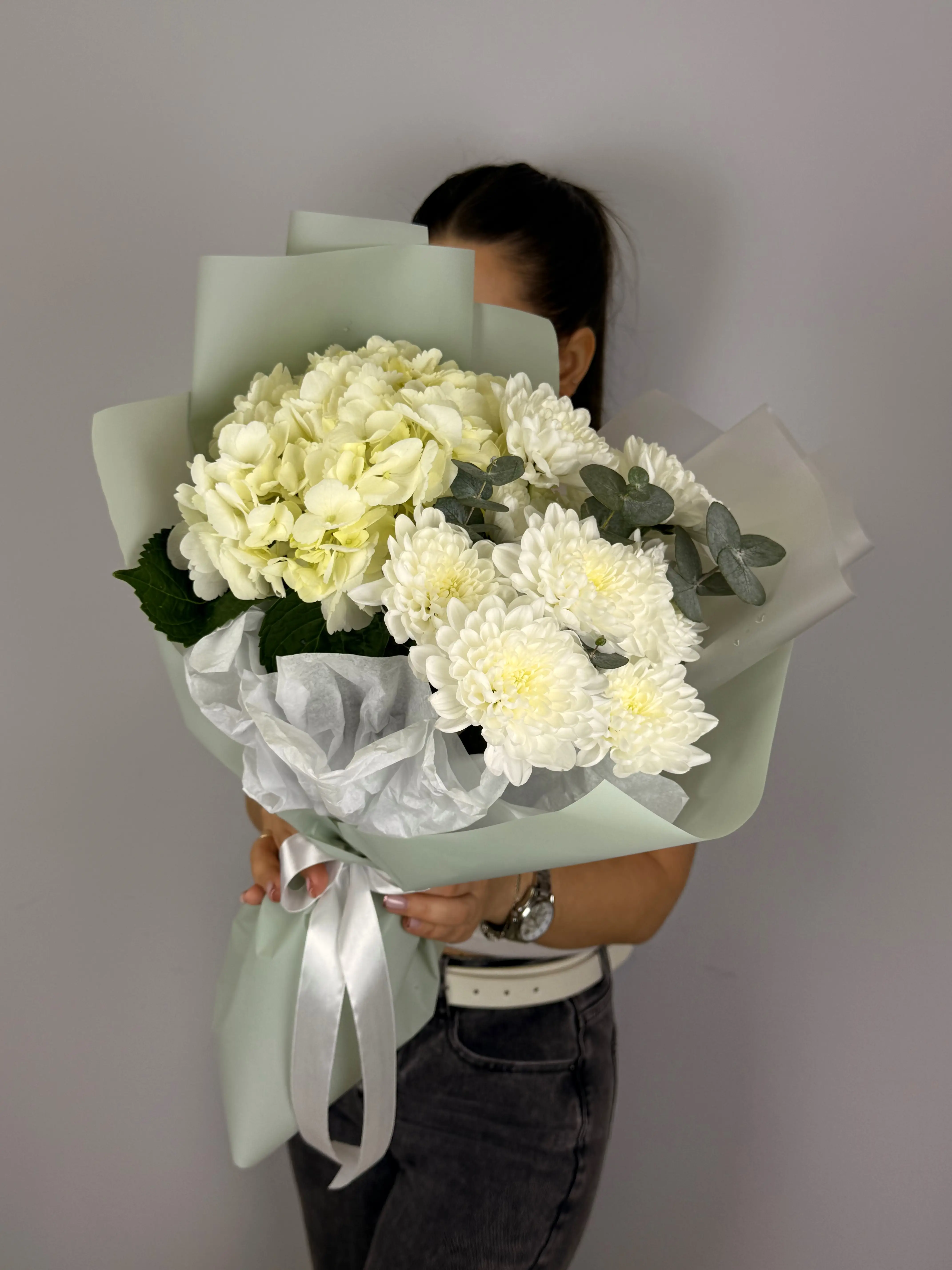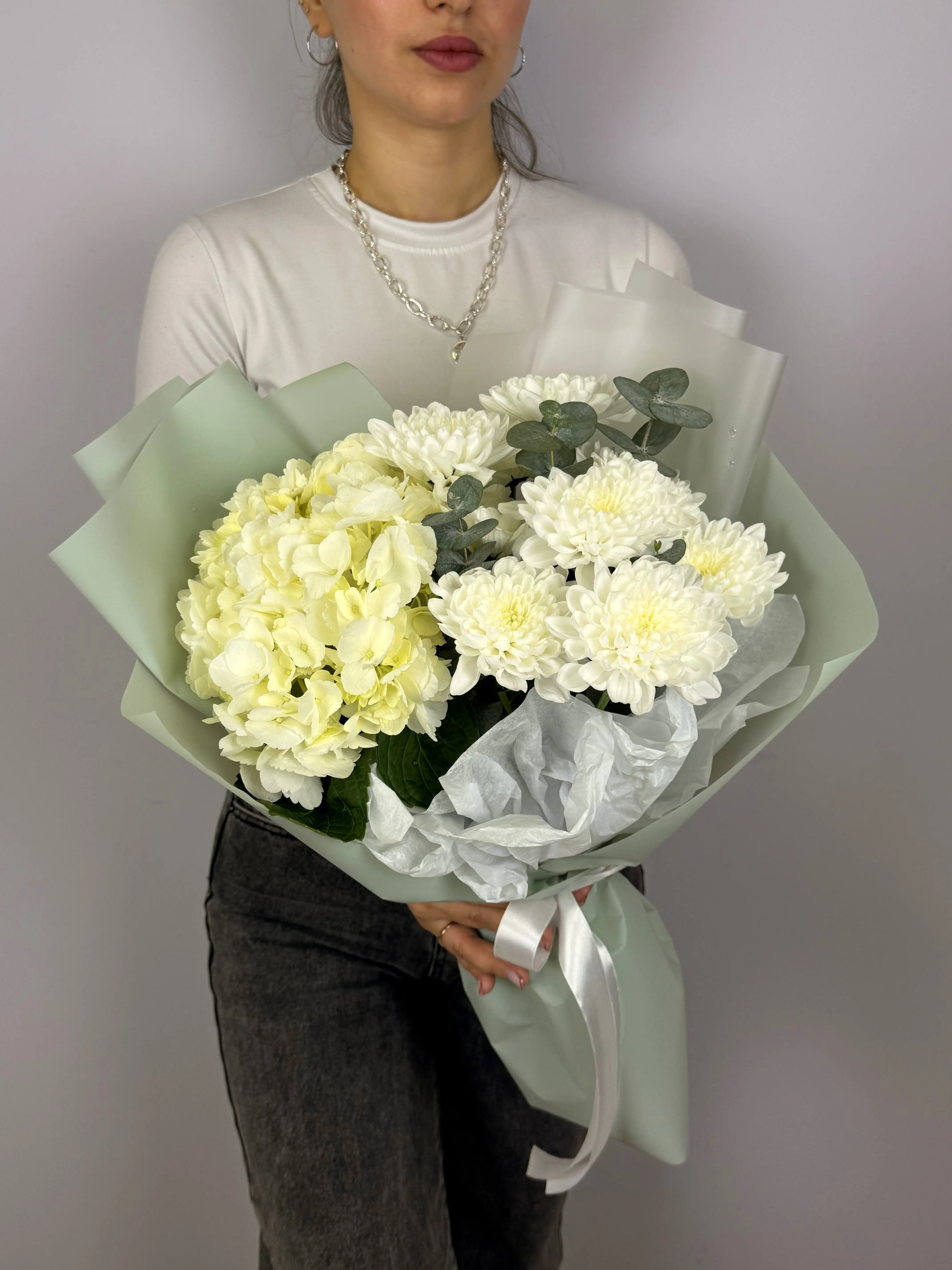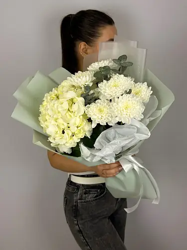 Букет с белой гортензией и хризантемой — чистый и объемный вариант, который добавит свежести и гармонии в подарок. Подойдет для романтического жеста, дня рождения или просто чтобы выразить спокойствие и заботу.