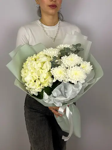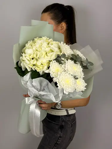 Букет с белой гортензией и хризантемой