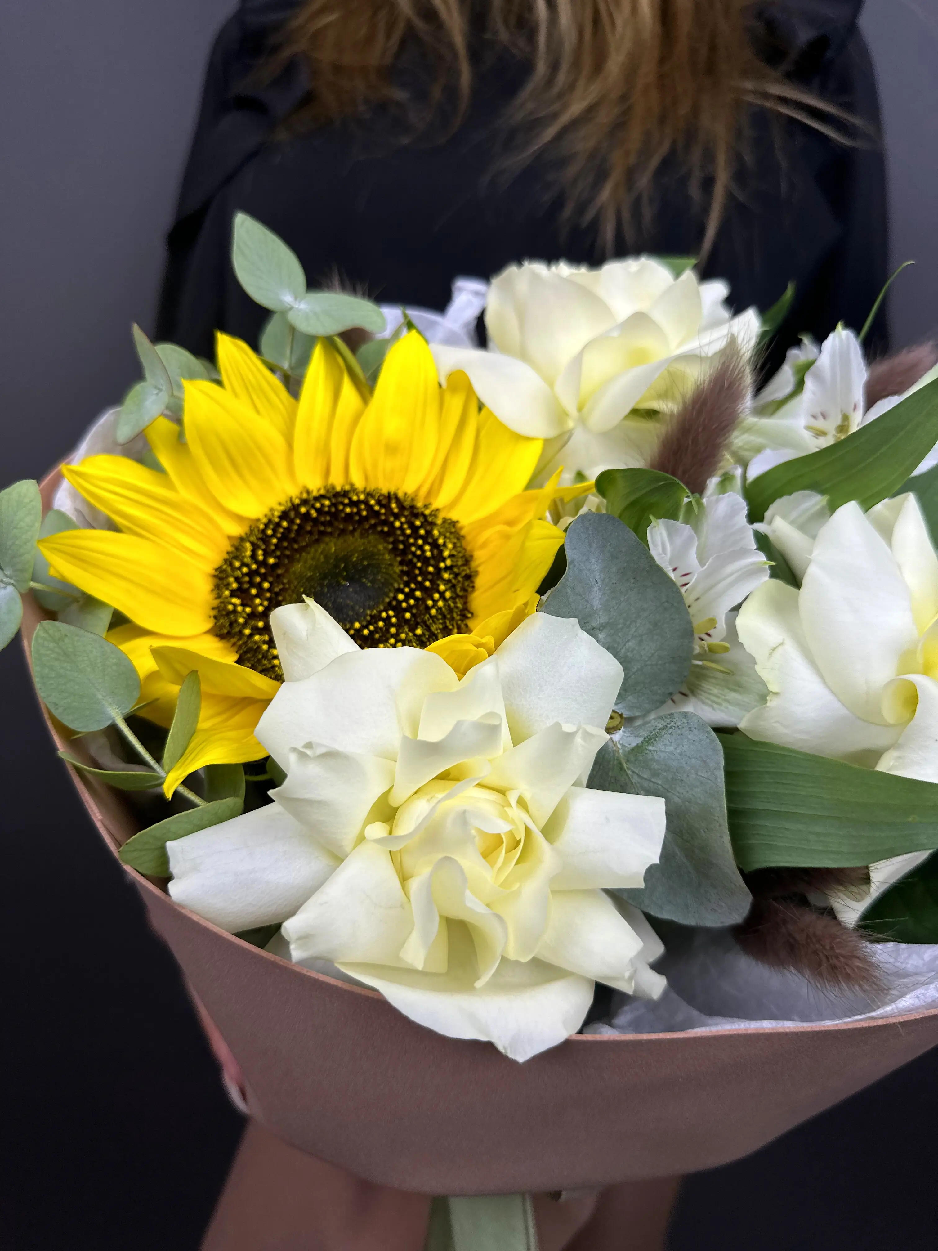 Подарите себе или своим близким моменты радости и красоты с нашим букетом из подсолнухов и альстромерий. Это не просто букет, а настоящее воплощение солнечного настроения и свежести, которое подарит улыбку и поднимет настроение.