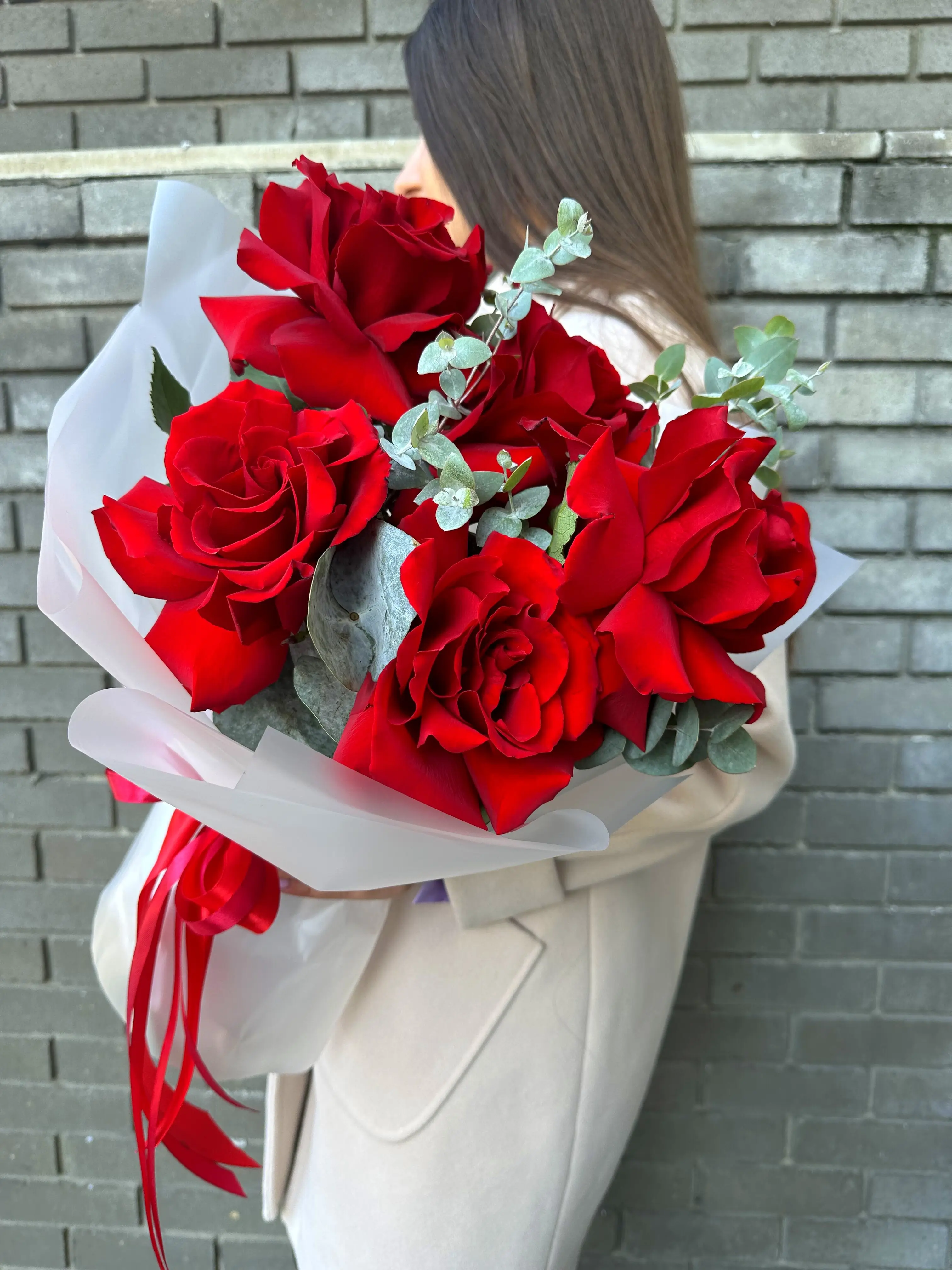 Каждая роза в этом букете отличается свежестью и стойкостью, что позволяет им сохранять свою красоту на протяжении длительного времени. Эвкалипт придает букету дополнительную свежесть и делает его еще более привлекательным. Такой букет станет прекрасным подарком на любой праздник или просто способом выразить свои чувства.