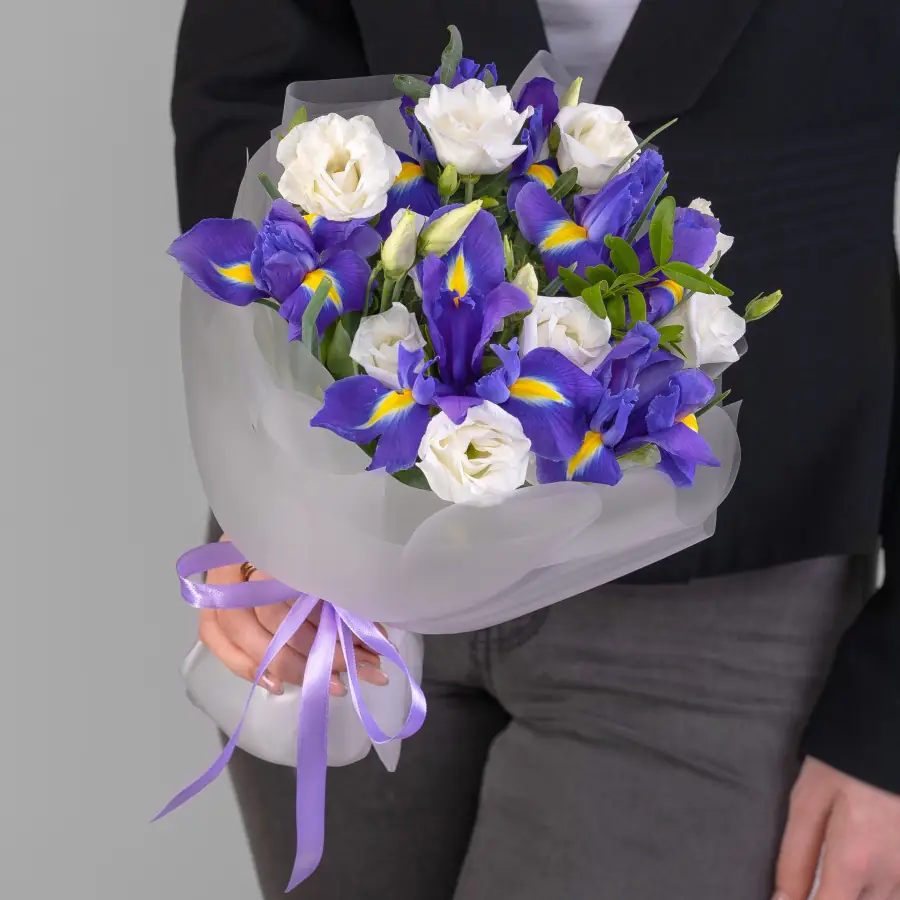 Подарите загадку и нежность в одном изысканном букете. Эта утонченная композиция, в которой величественные ирисы гармонично сочетаются с хрупкими эустомами, создает ощущение таинственности и трогательной красоты. Наполненная изяществом и грацией, она станет воплощением самых глубоких и искренних чувств. Ирисы, известные как символы мудрости, доверия и надежды, придают букету царственную элегантность и выразительность. Их изысканные линии и насыщенные оттенки идеально дополняются нежными лепестками эустомы — олицетворения невинности, чистоты и душевной гармонии. Этот союз создает неповторимый контраст силы и хрупкости, а палитура нежных и глубоких тонов дарит ощущение спокойствия и восхищения. Этот букет станет прекрасным выбором для торжественного события, в качестве комплимента утонченной натуре, на день рождения или просто как знак восхищения и поддержки. Он упакован в элегантную сдержанную упаковку, которая подчеркивает благородство цветов и сохраняет их свежесть. Подарите близким частичку вдохновения и гармонии. Выберите этот прекрасный букет — символ мудрости, чистоты и новых светлых начинаний.