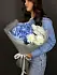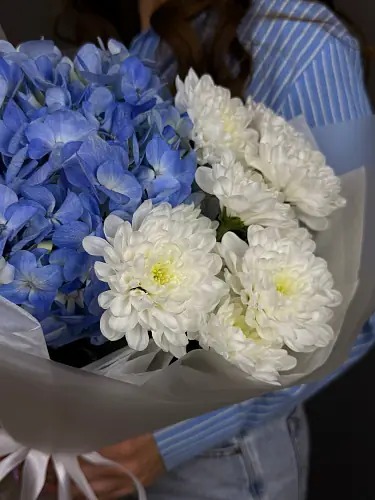 Вашему вниманию предлагается изумительный букет, в котором нежная голубая гортензия встречает свою компанию с кустовой хризантемой. Эта композиция воплощает собой гармонию и стиль, радуя взгляд своими мягкими линиями и изысканными оттенками.