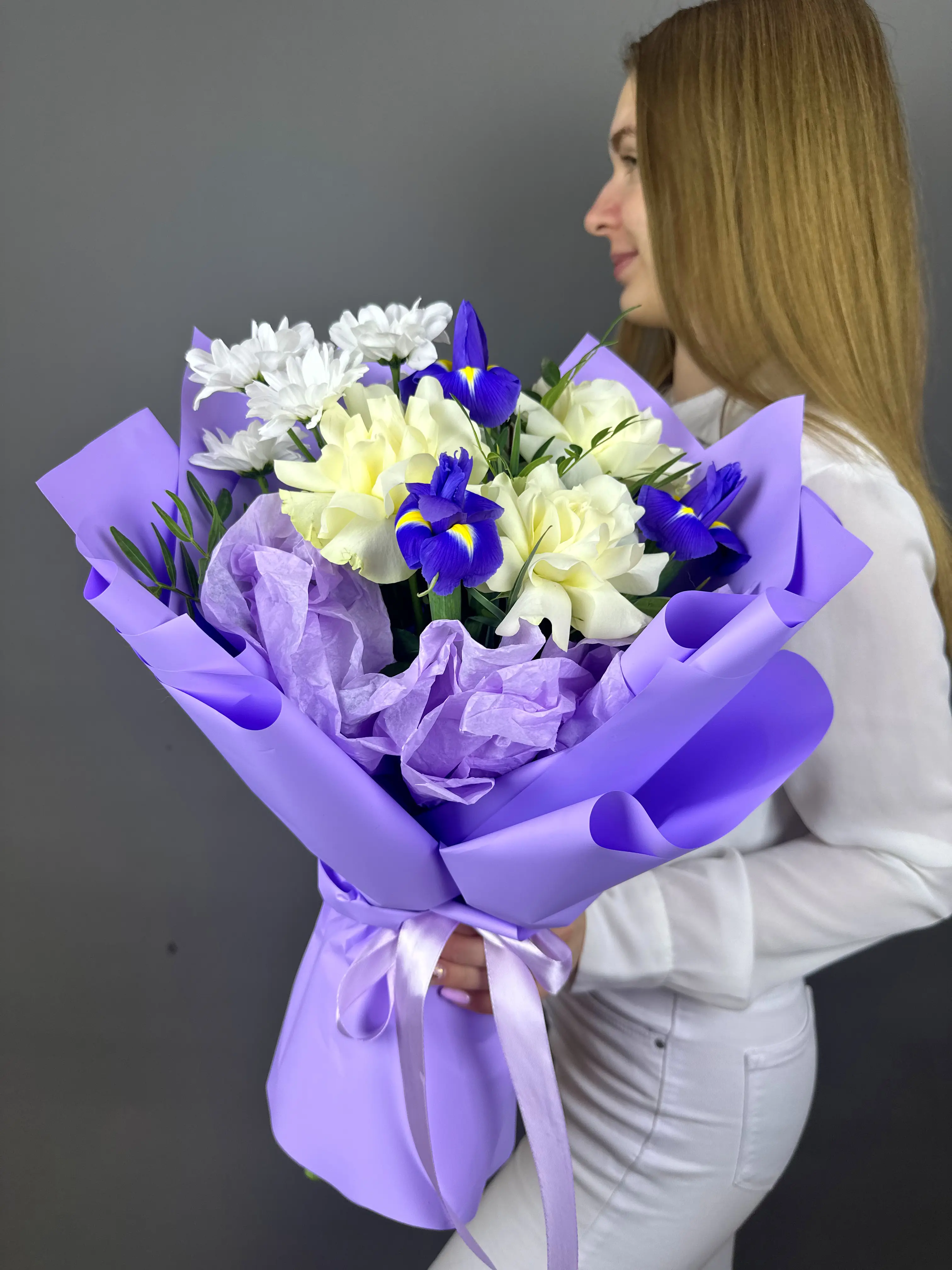 Ирисы, символизирующие мудрость, доверие и надежду, придают букету царственную выразительность и таинственность. Их изысканные линии и насыщенные оттенки идеально гармонируют с бархатистой нежностью роз — вечных символов любви, страсти и восхищения. Этот союз создает неповторимую игру смыслов и красок, даря ощущение гармонии, силы и вдохновения.