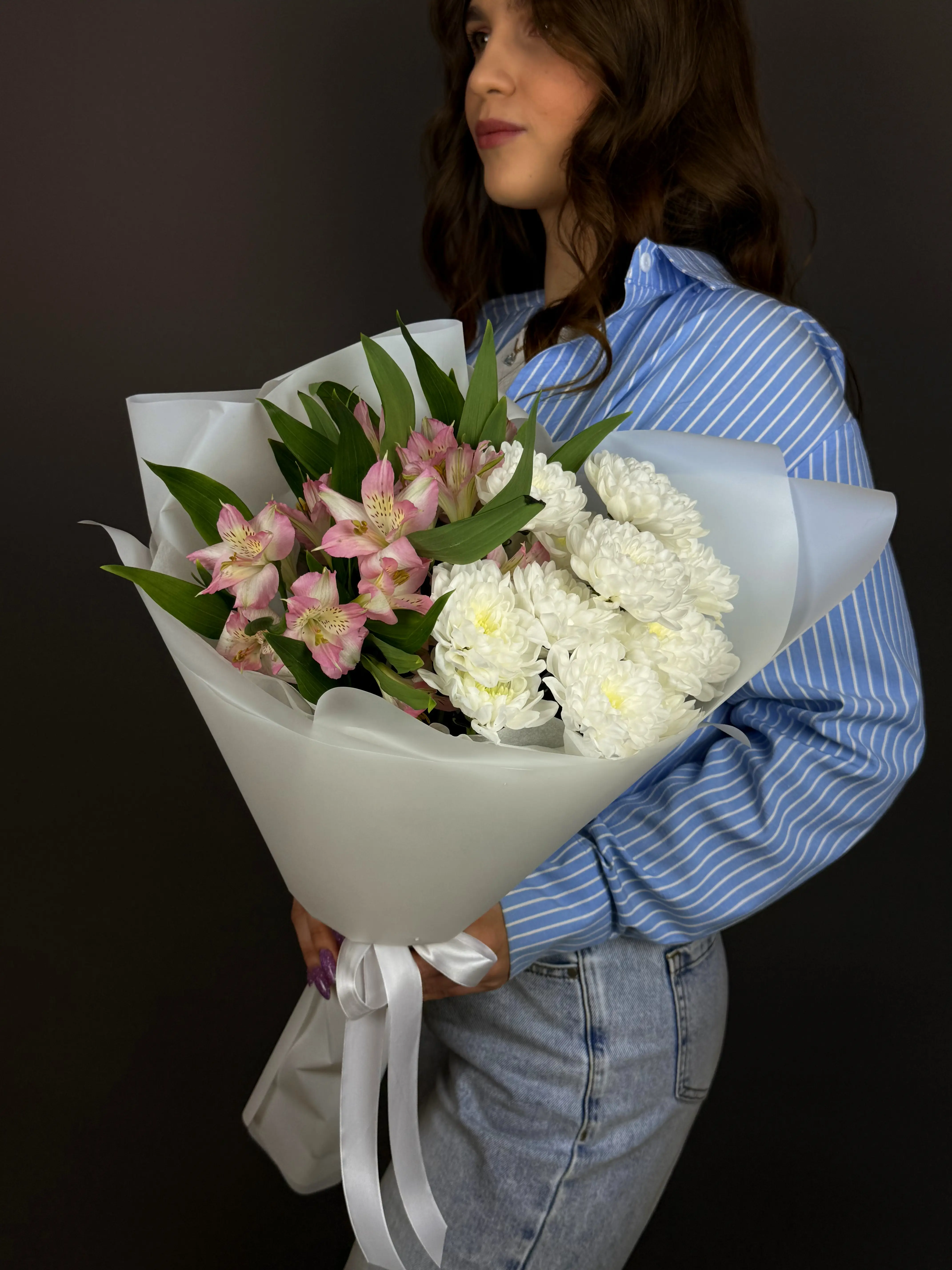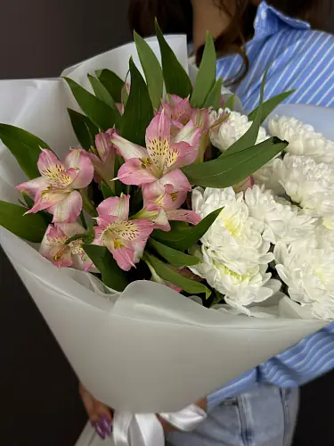 Альстромерии известны своими изящными формами и разнообразием оттенков, что делает их идеальными для создания романтических и трогательных композиций. Кустовые хризантемы, в свою очередь, добавят яркости и выразительности, привлекая внимание к каждой детали букета.
