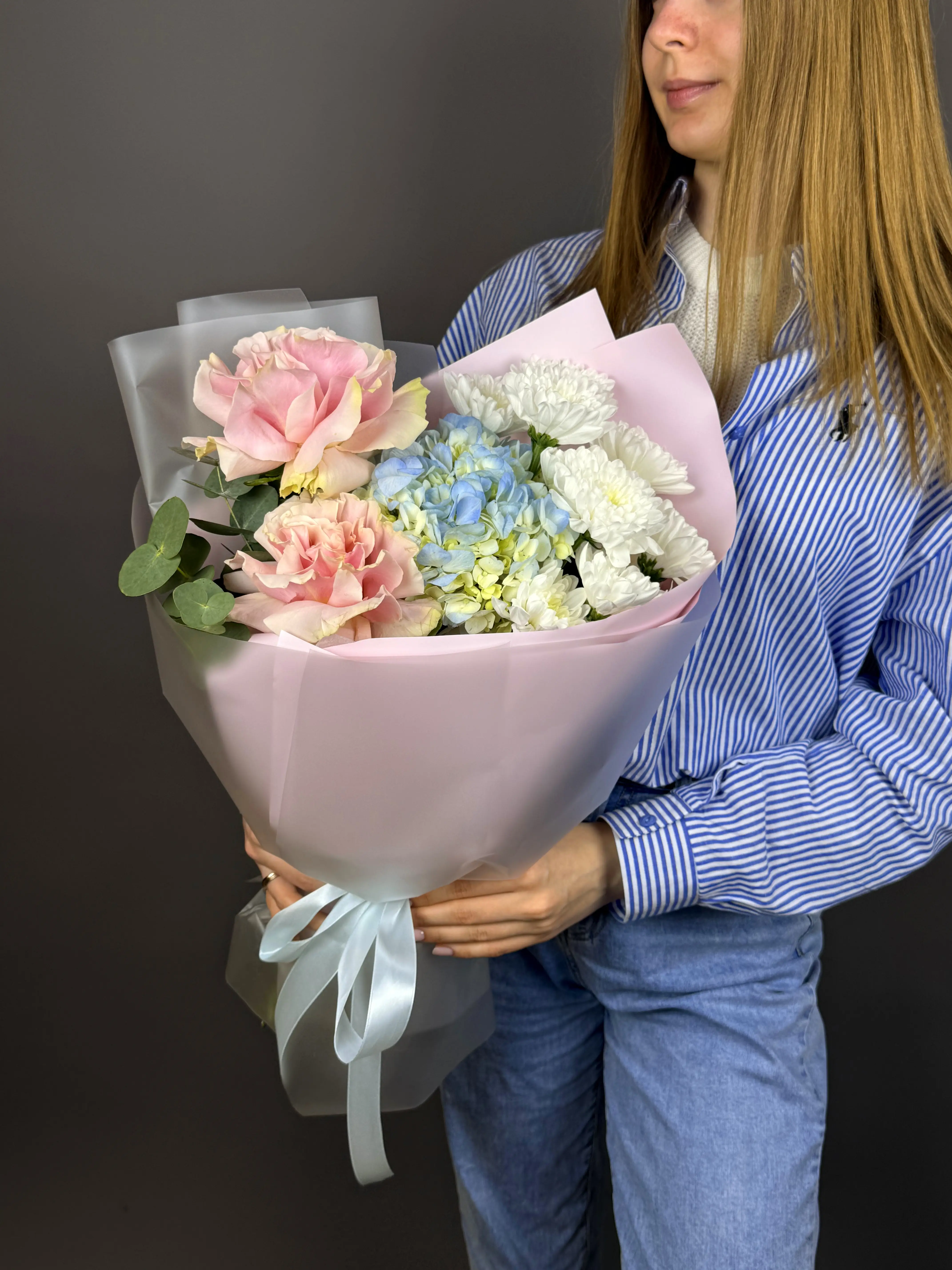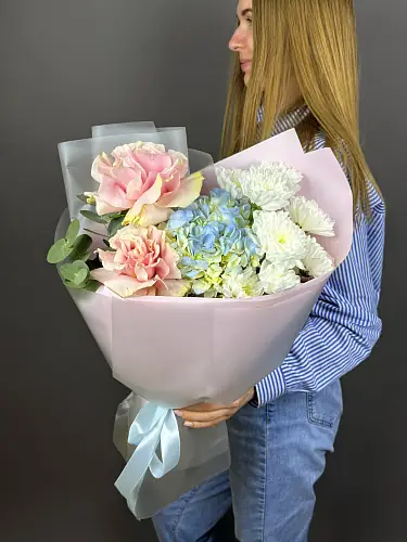 Розы в нежных оттенках дарят букету теплый центр и деликатный аромат, а голубая гортензия обволакивает все объемными, лазурными шарами для ощущения легкости и глубины. В итоге — утонченная, но доступная аранжировка, которая оживит спальню, подоконник или станет акцентом на романтическом столе.