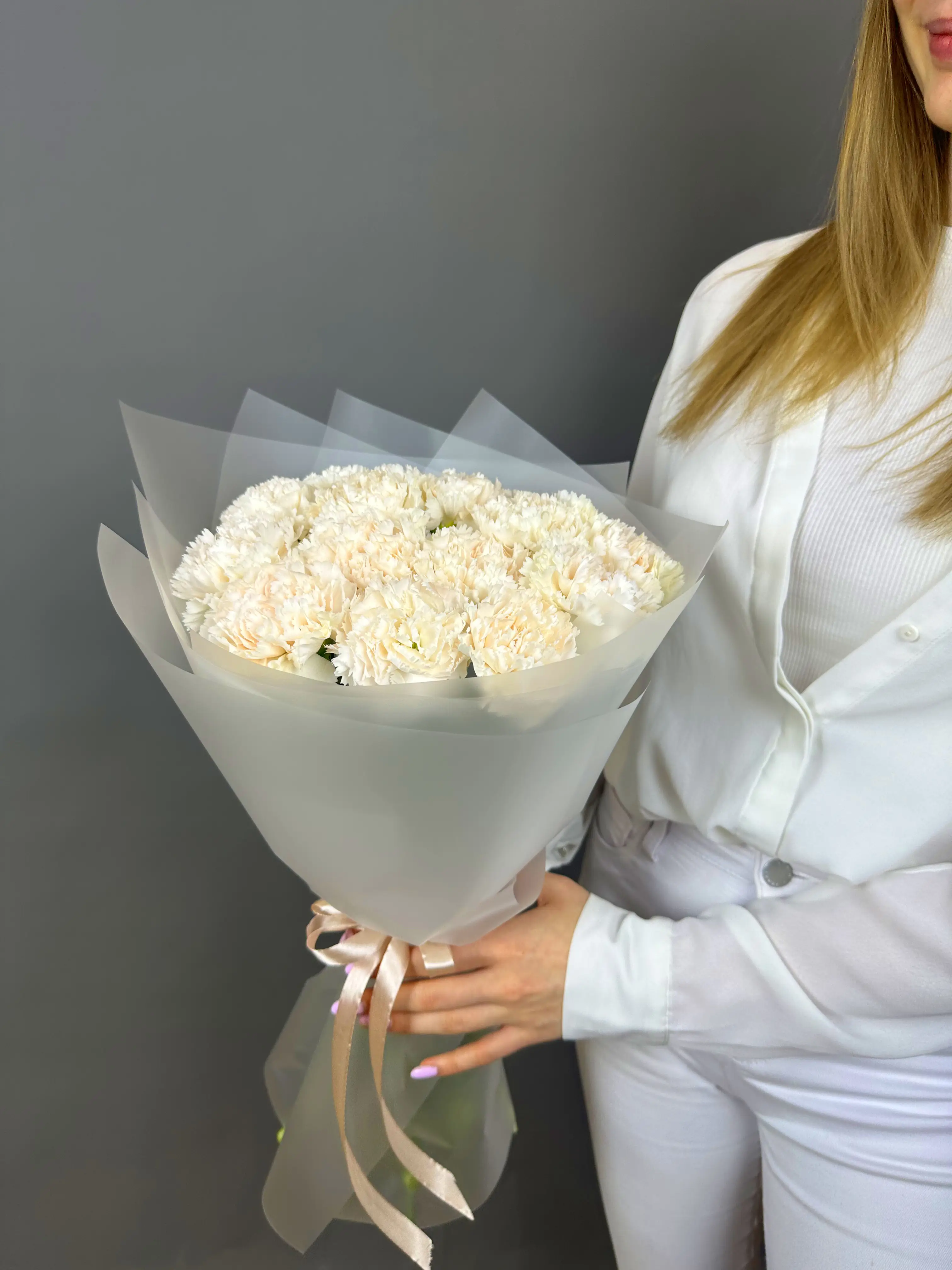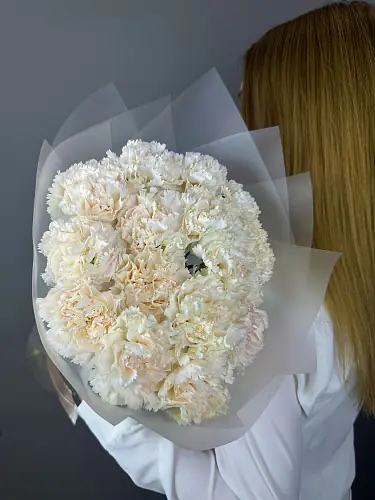 Подарите себе и своим близким немного тепла и красоты с этим замечательным букетом из 15 кремовых диантусов.
