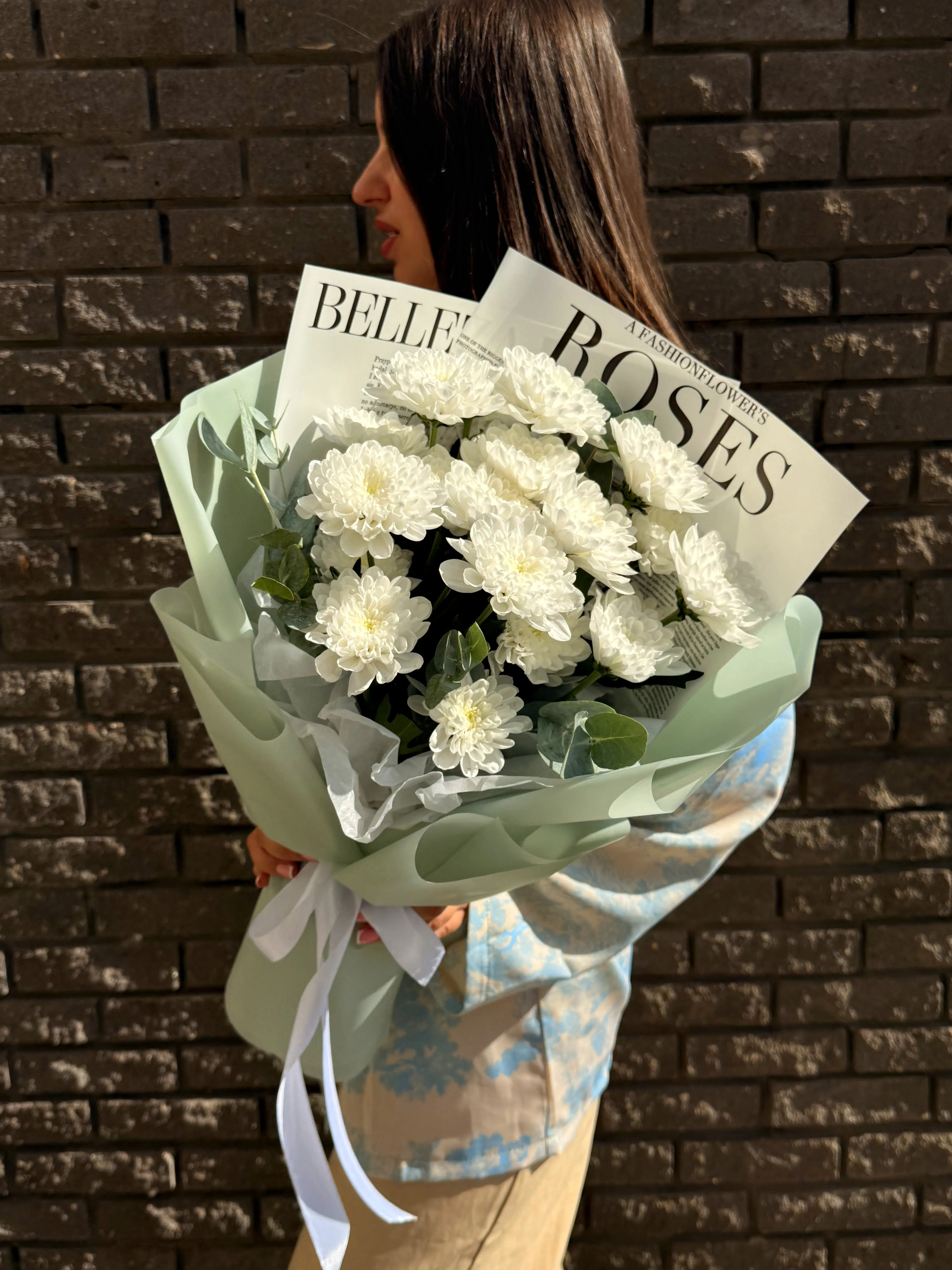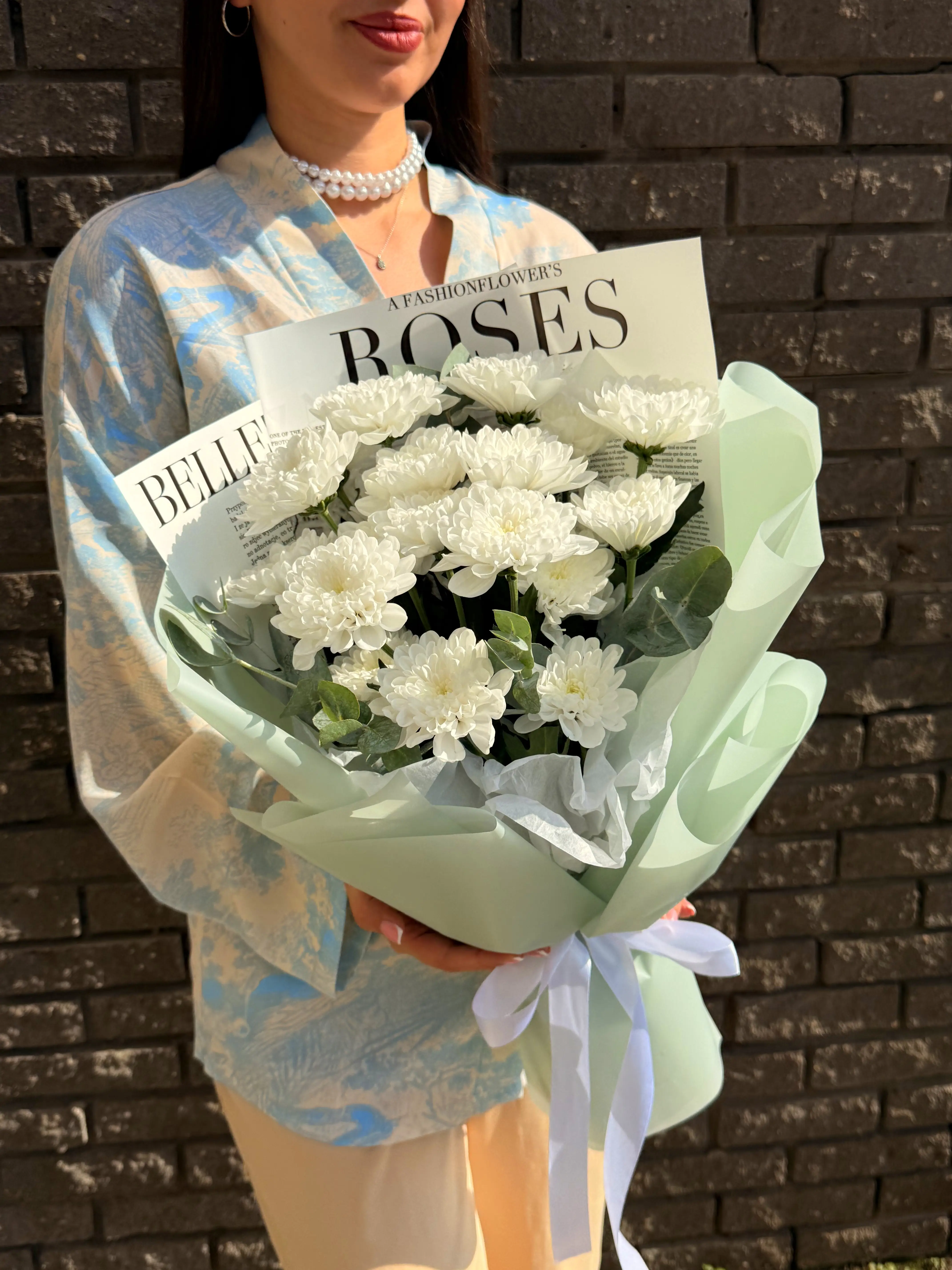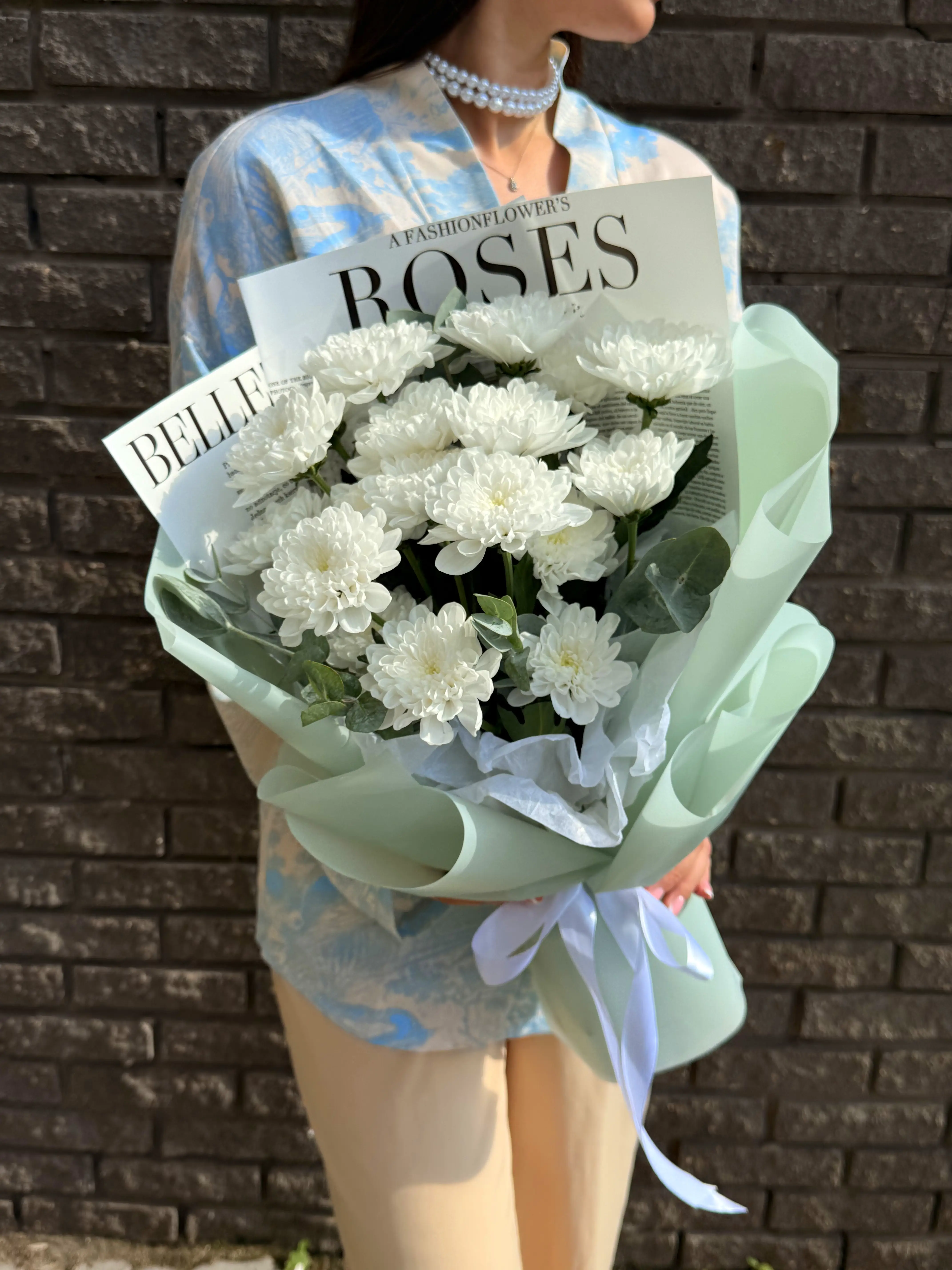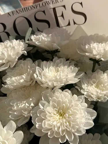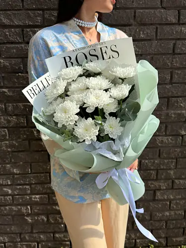 Кустовые хризантемы — воплощение естественной красоты и щедрости природы. Их нежные лепестки, играющие мягкими переходами оттенков, дарят ощущение уюта и безмятежности, а устойчивость и свежесть цветов позволяют наслаждаться их красотой долгое время. Стильная упаковка подчёркивает графичность и современность букета, сохраняя его аккуратный вид и хрупкость.