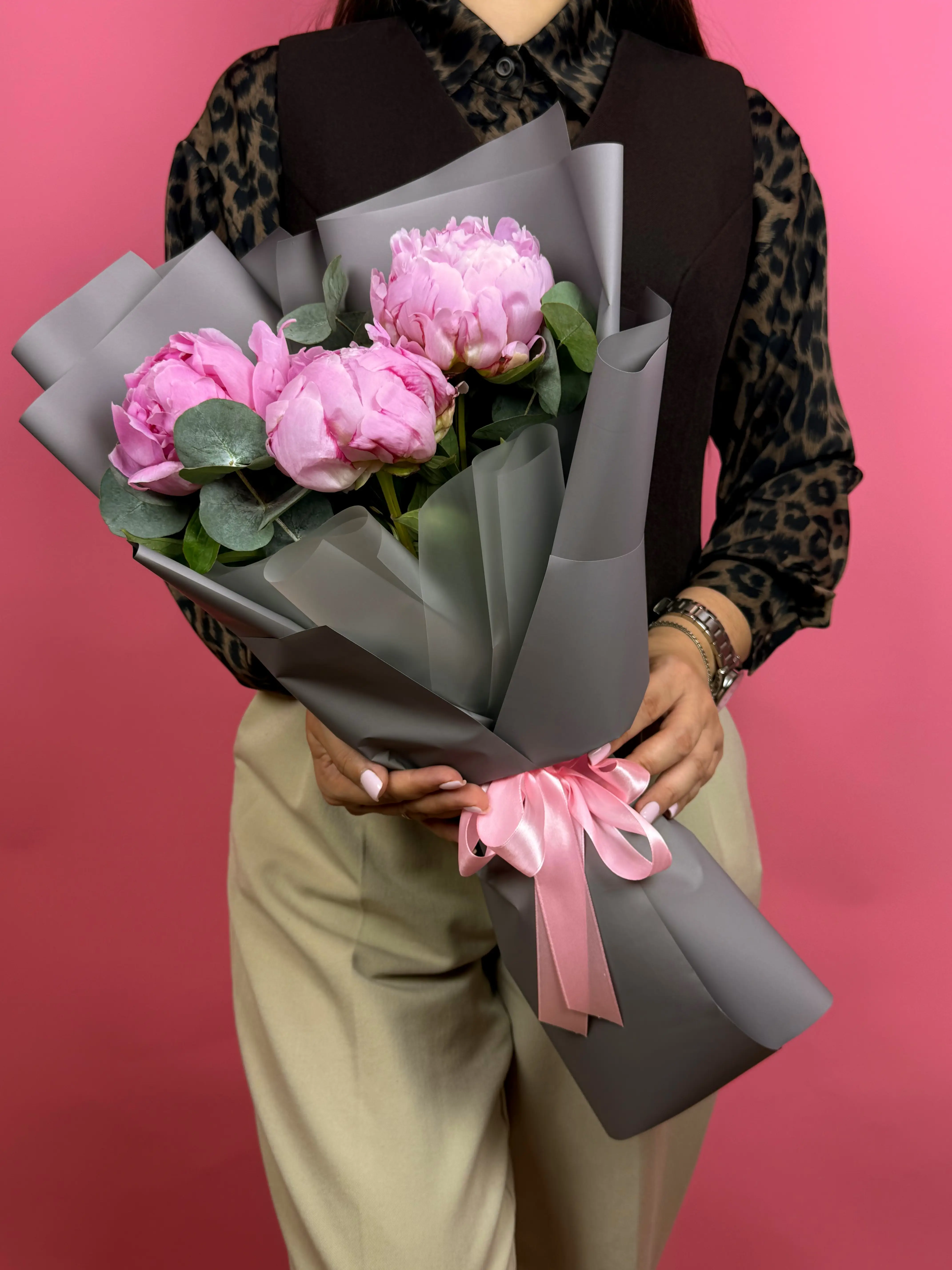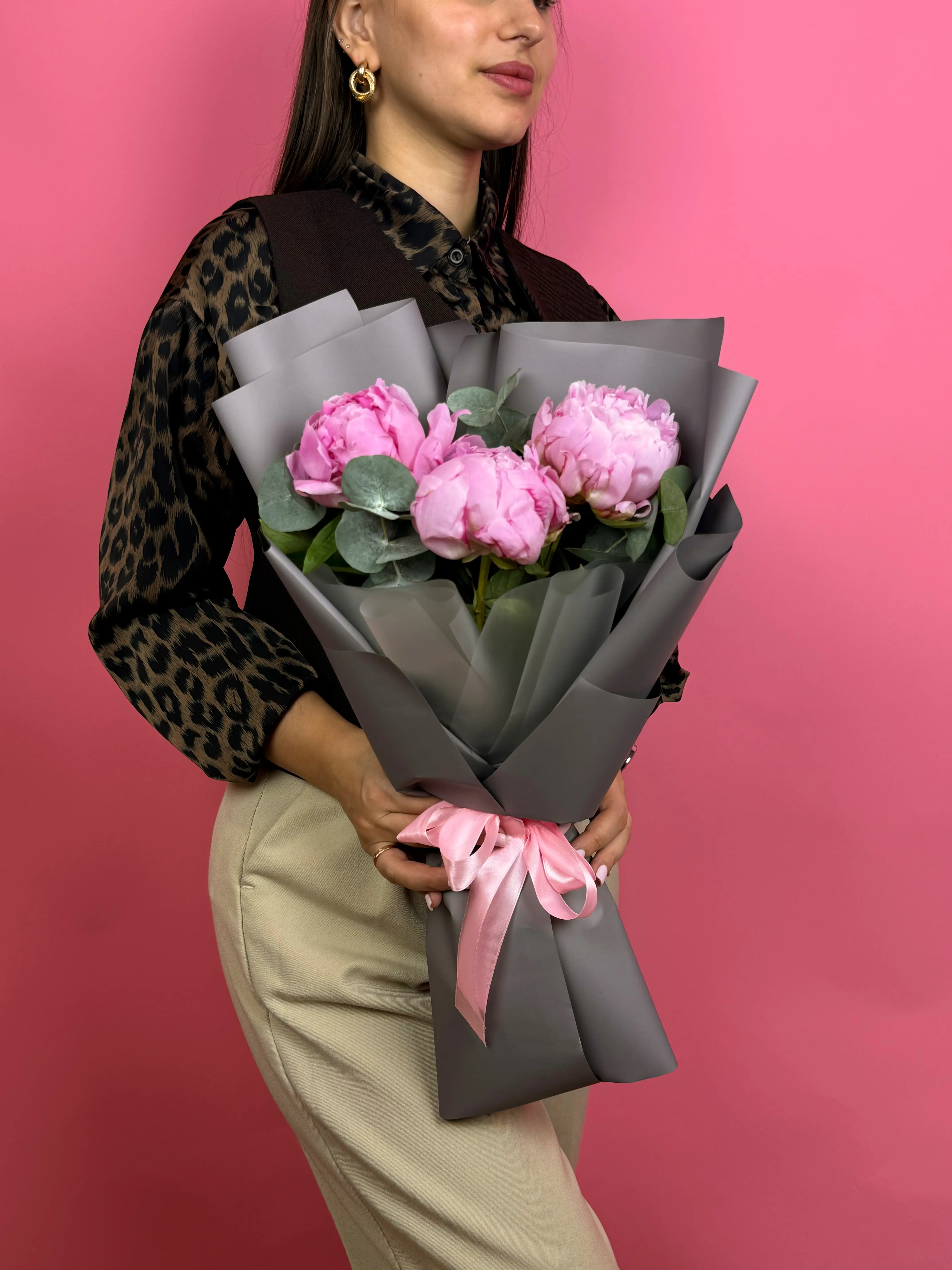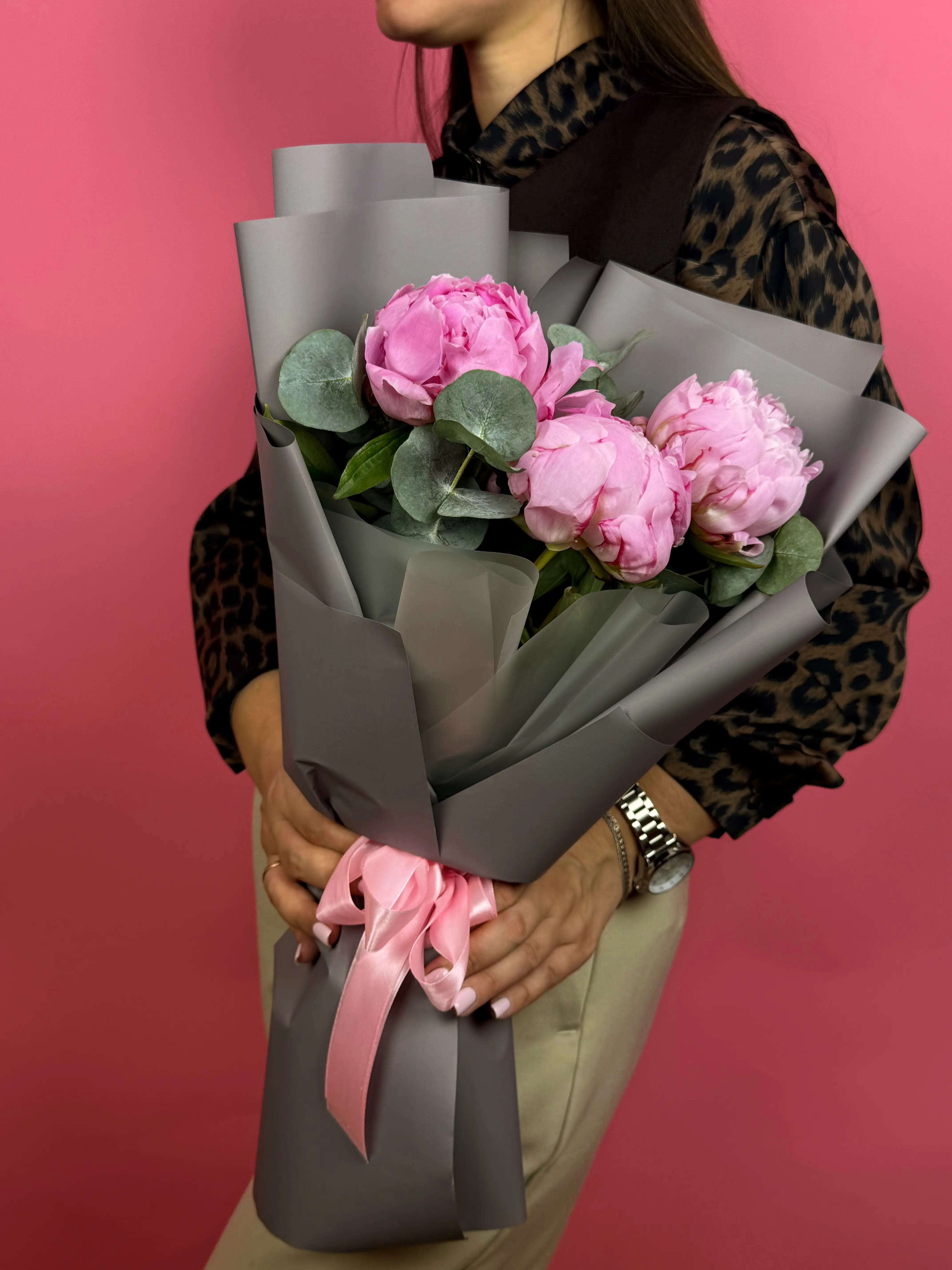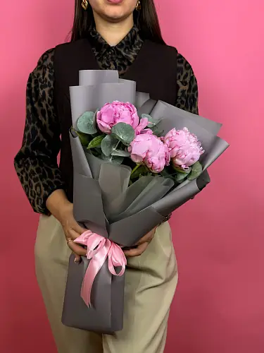 Подарите близкому человеку минуты радости и удовольствия, купив стильную и красивую композицию из трех пионов с эвкалиптом в упаковке — символ любви, элегантности и хорошего вкуса.