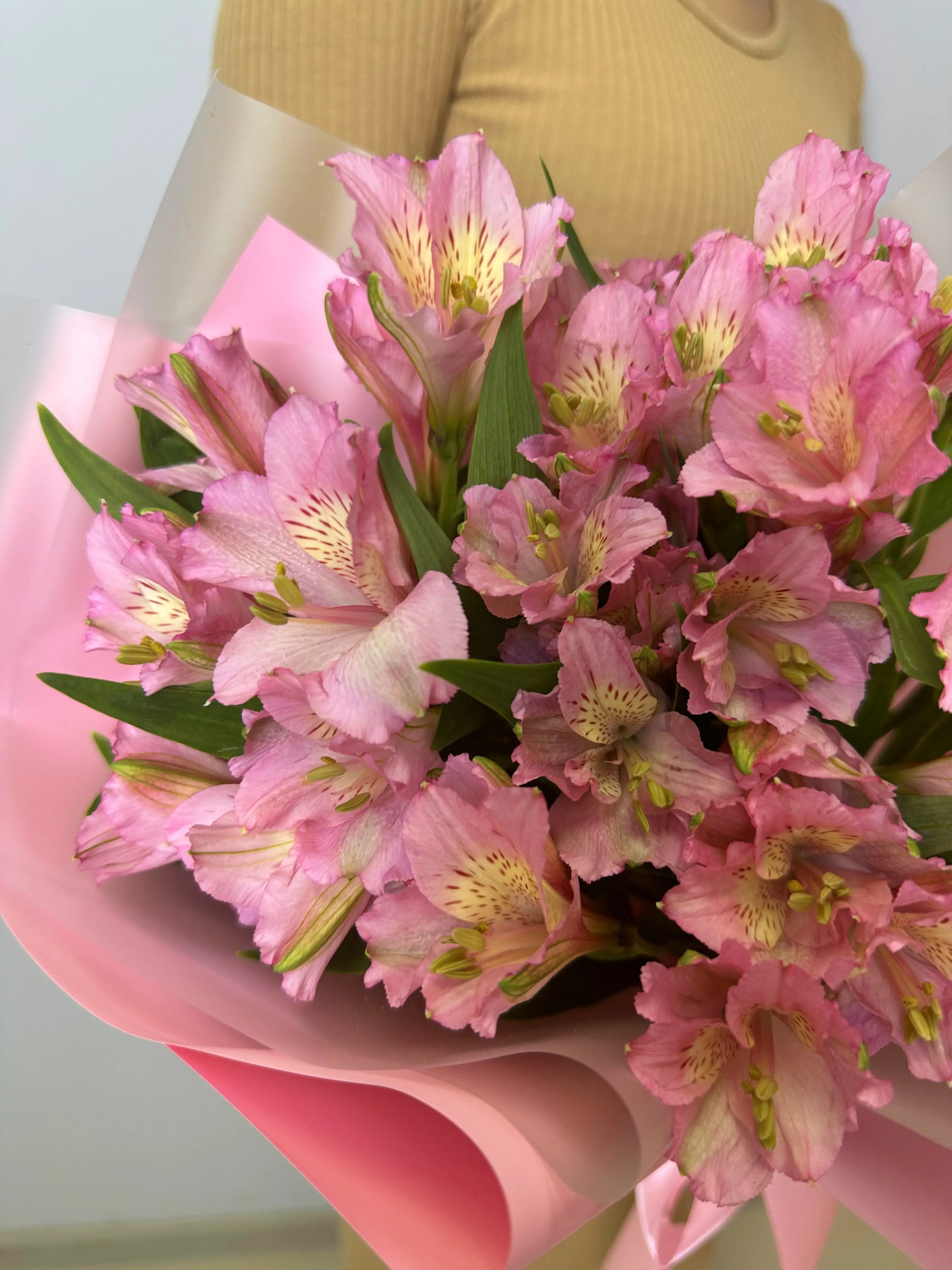 Каждая альстромерия в этом букете отличается свежестью и стойкостью, что позволяет ей сохранять свою красоту на протяжении длительного времени. Букет оформлен таким образом, чтобы подчеркнуть красоту и изящество каждого цветка.