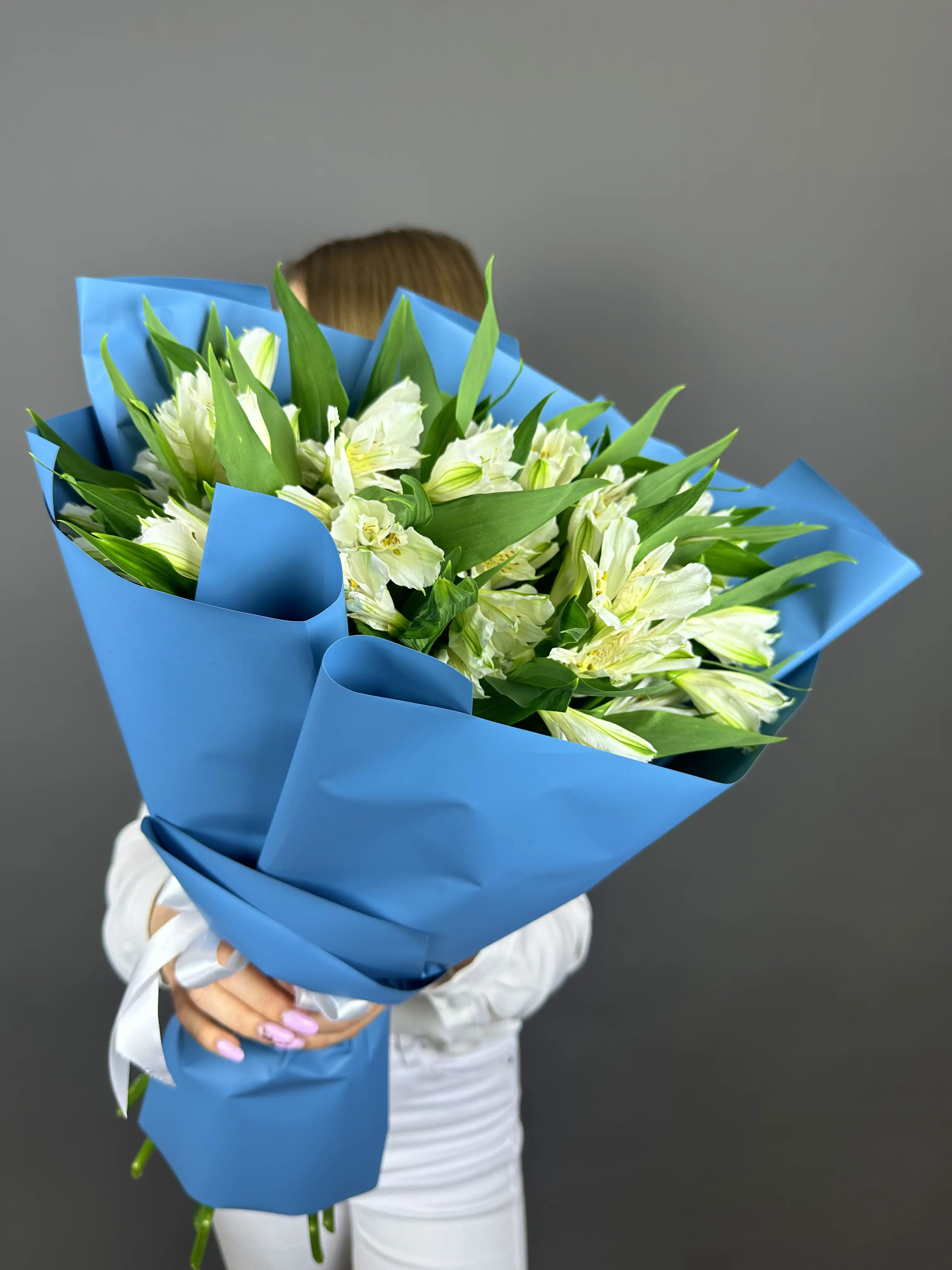 Каждый цветок в этом букете аккуратно собран и сформирован в гармоничную композицию, которая завораживает своей чистотой и нежностью. Белые альстромерии выглядят особенно свежо и воздушно, добавляя вашему дому или событию ощущение легкости и уюта. Благодаря своему изящному внешнему виду, они станут прекрасным дополнением к любому интерьеру или событию, подчеркнув ваше внимание к деталям и стремление к гармонии.