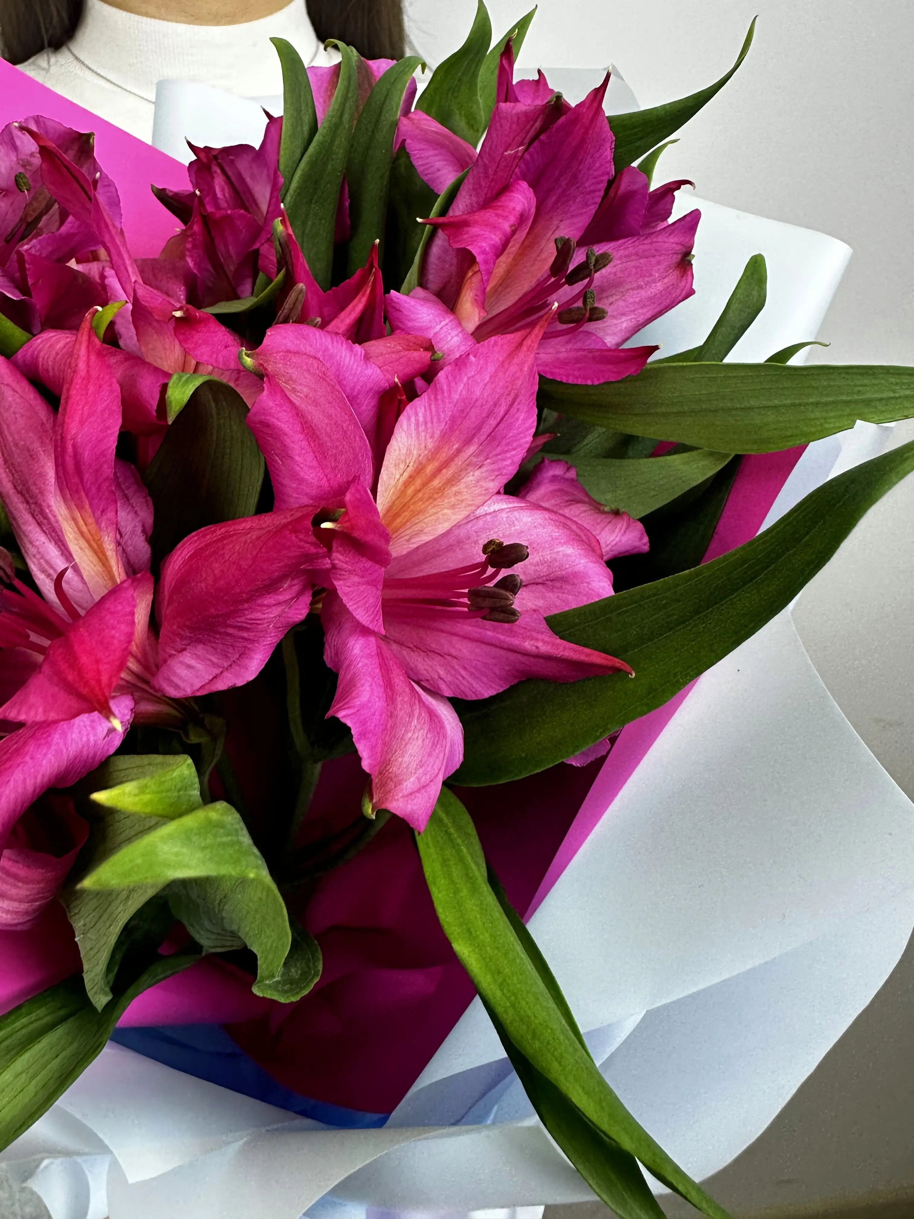 Букет состоит из трёх роскошных альстромерий, каждая из которых имеет свою уникальную расцветку, что делает композицию особенно эффектной. Такие цветы прекрасно смотрятся как самостоятельный подарок, так и в качестве дополнения к более крупному букету.