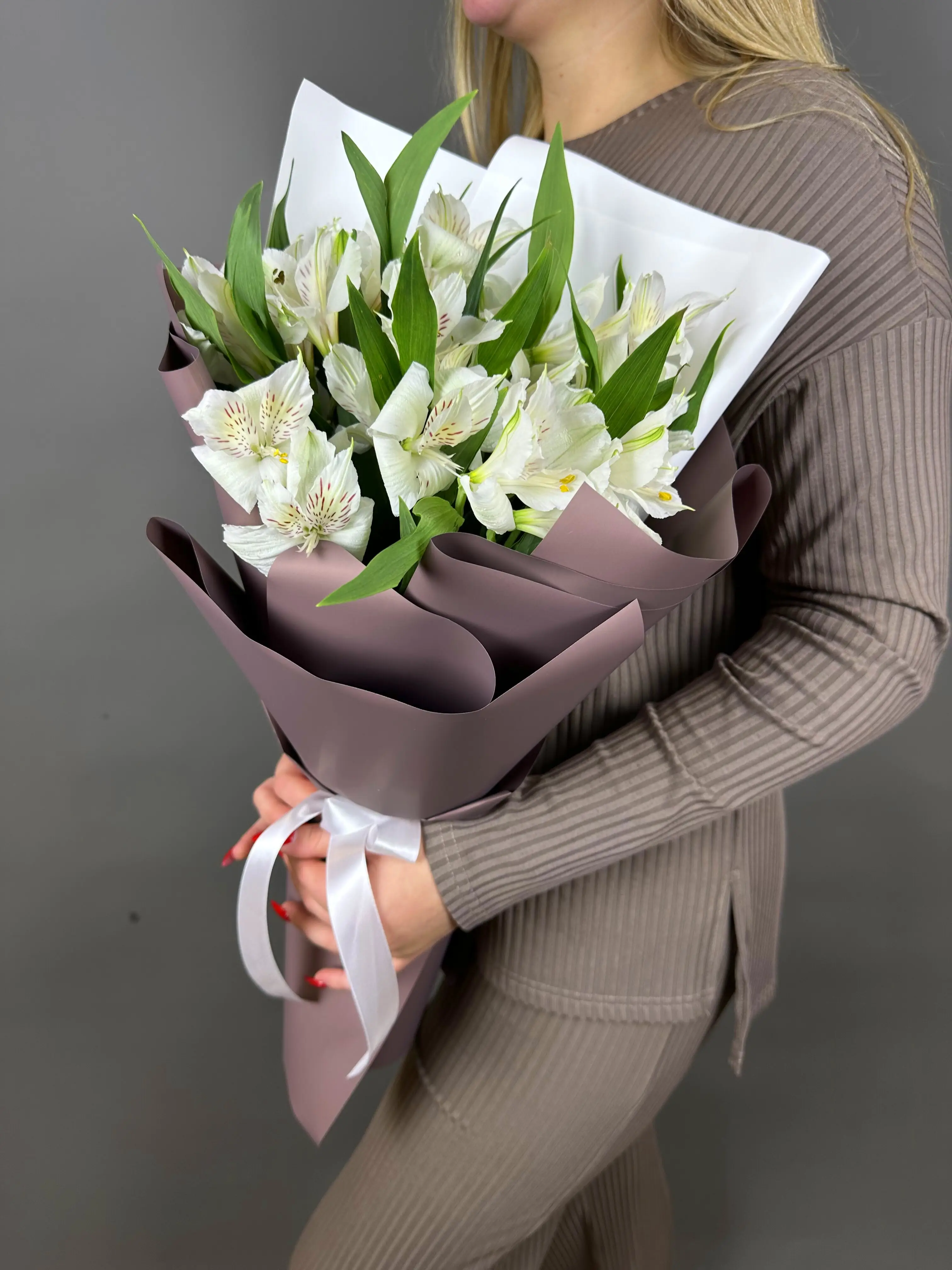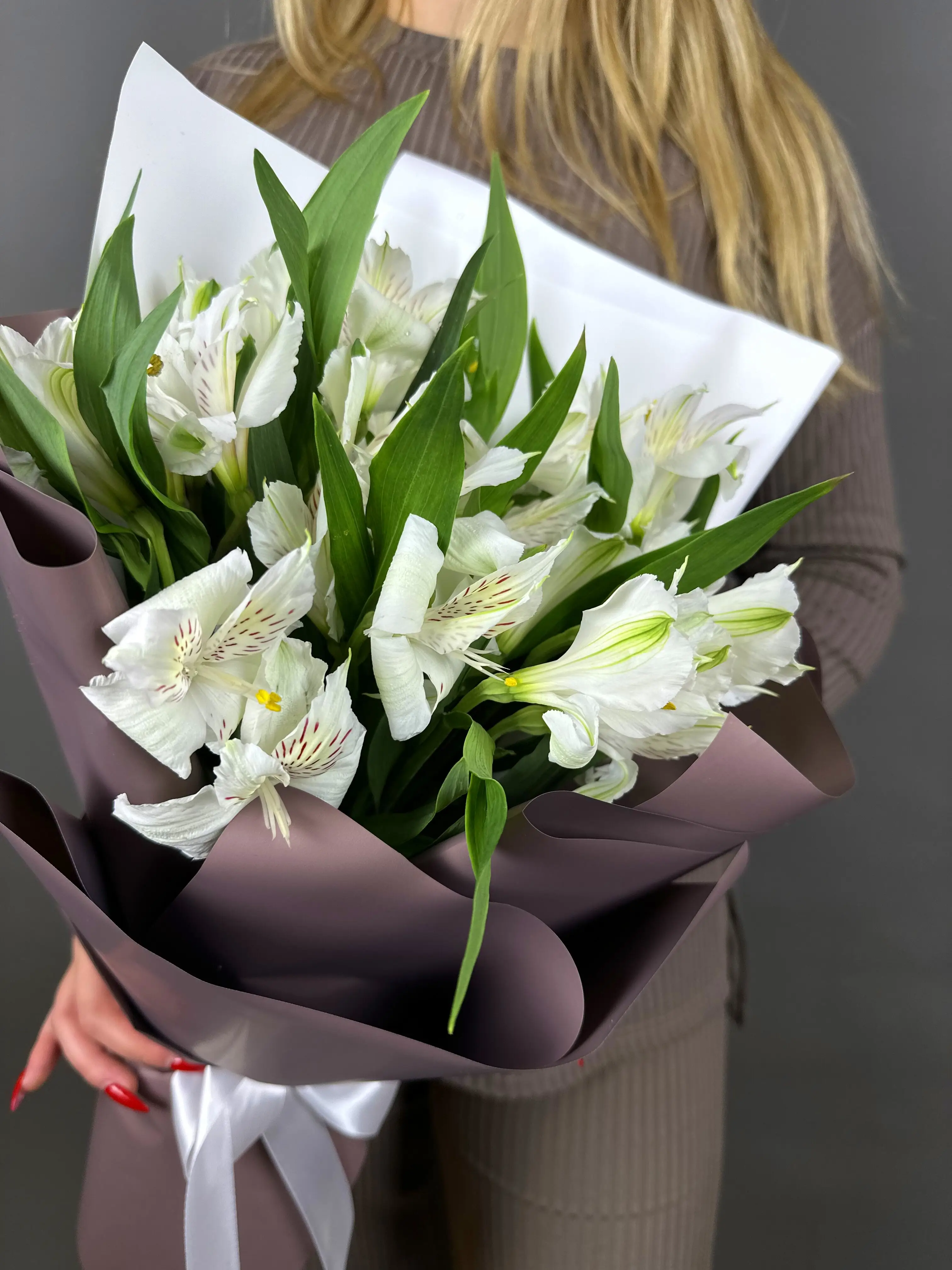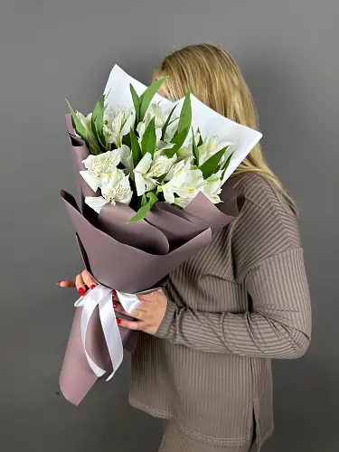 Каждая альстромерия в этом букете тщательно отобрана и составлена в единую композицию, благодаря чему букет выглядит гармонично и аккуратно. Белые альстромерии добавят нотку свежести и утонченности в любой интерьер, будь то домашняя обстановка или официальное мероприятие. Этот букет станет прекрасным дополнением к любому празднику, будь то день рождения, годовщина или романтическое свидание.