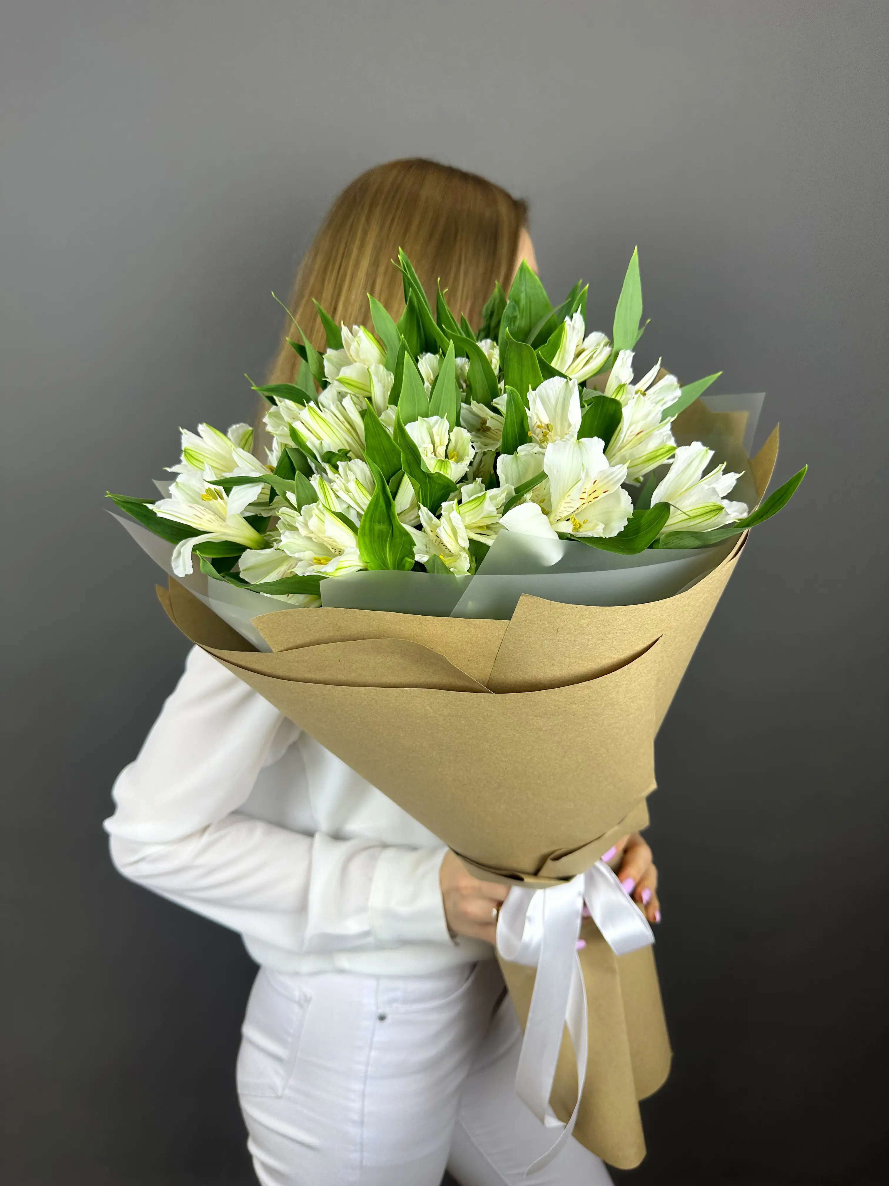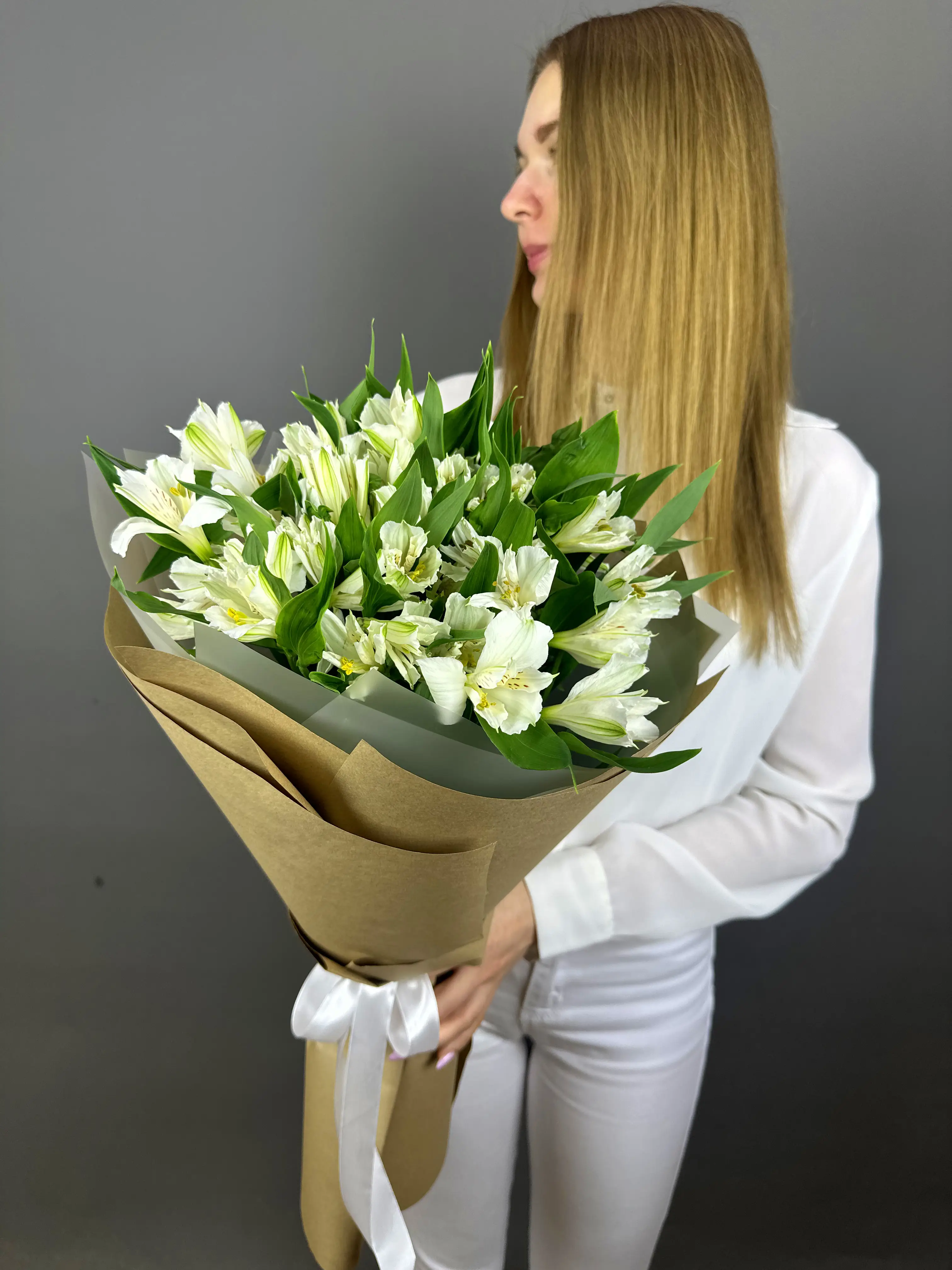Такой букет станет прекрасным выбором для любого повода: будь то день рождения, юбилей, свадебное торжество или просто знак внимания близкому человеку. Белоснежные лепестки альстромерий создают ощущение воздушности и нежности, подчеркивая вашу заботу и теплое отношение к получателю.