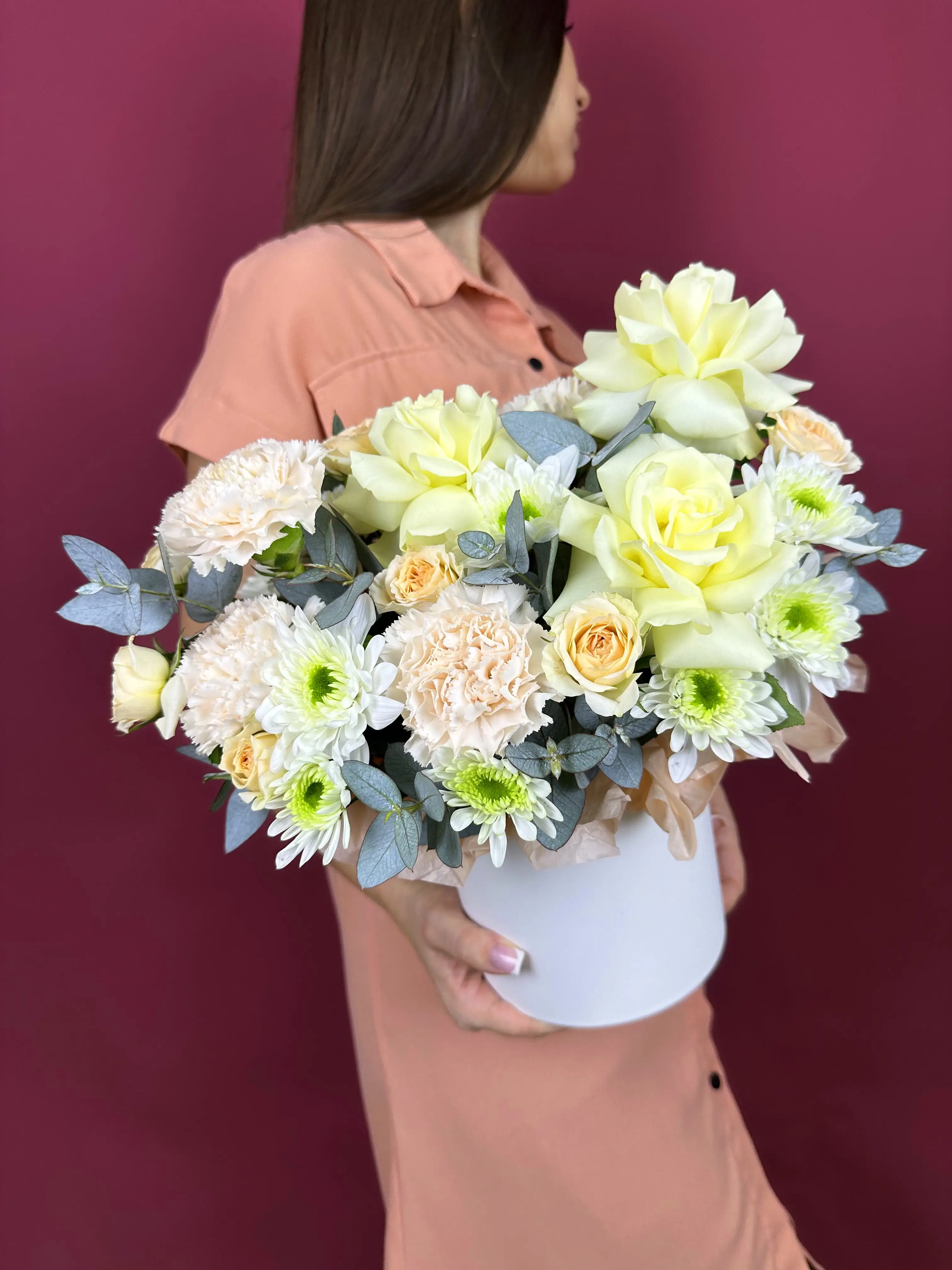 Нежная композиция с розами и хризантемой — изысканное сочетание нежных и чувственных цветов, которое неизменно привлекает взгляды и наполняет пространство теплом и уютом. Эта стильная и элегантная цветочная композиция понравится каждой женщине, станет идеальным подарком на важные даты: День рождения, 8 Марта, День матери, годовщину отношений, а также подходит для выражения нежных чувств в романтическом свидании.