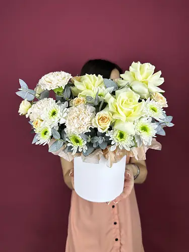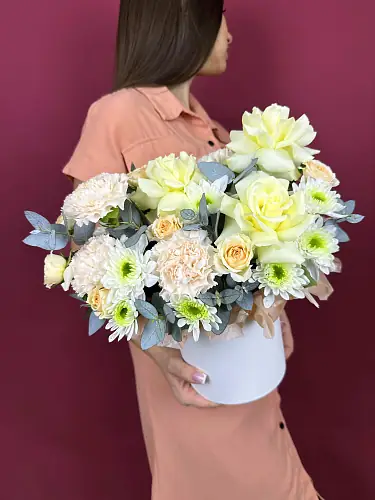 Соберем в день доставки, только из свежих цветов и затем с улыбкой вручим получателю.