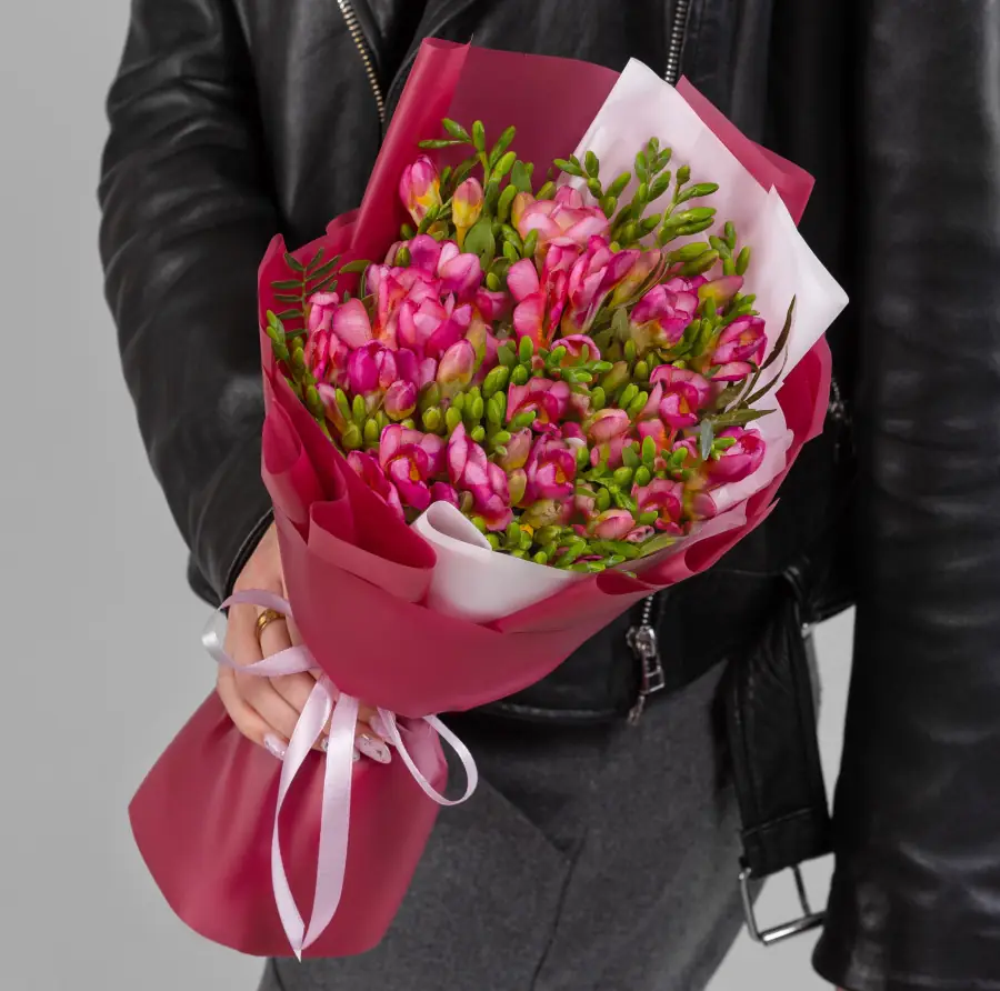 25 Малиновых Фрезий в упаковке — купить по цене от 6600 руб. с доставкой в Нижнем Новгороде