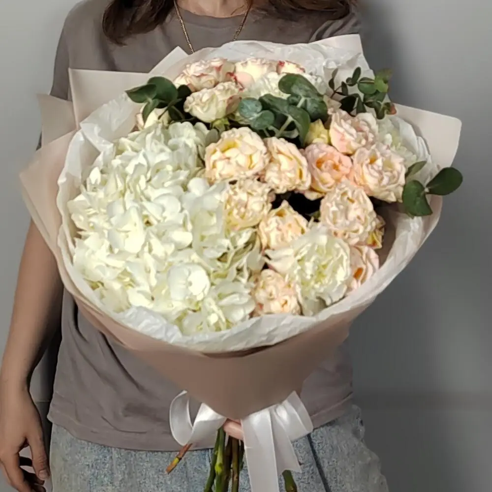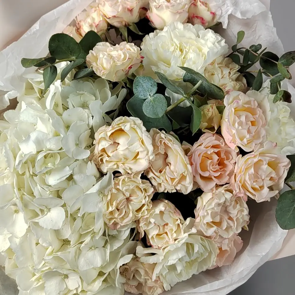 Букет из гортензии, кустовых роз и гвоздик