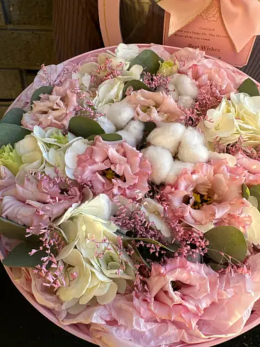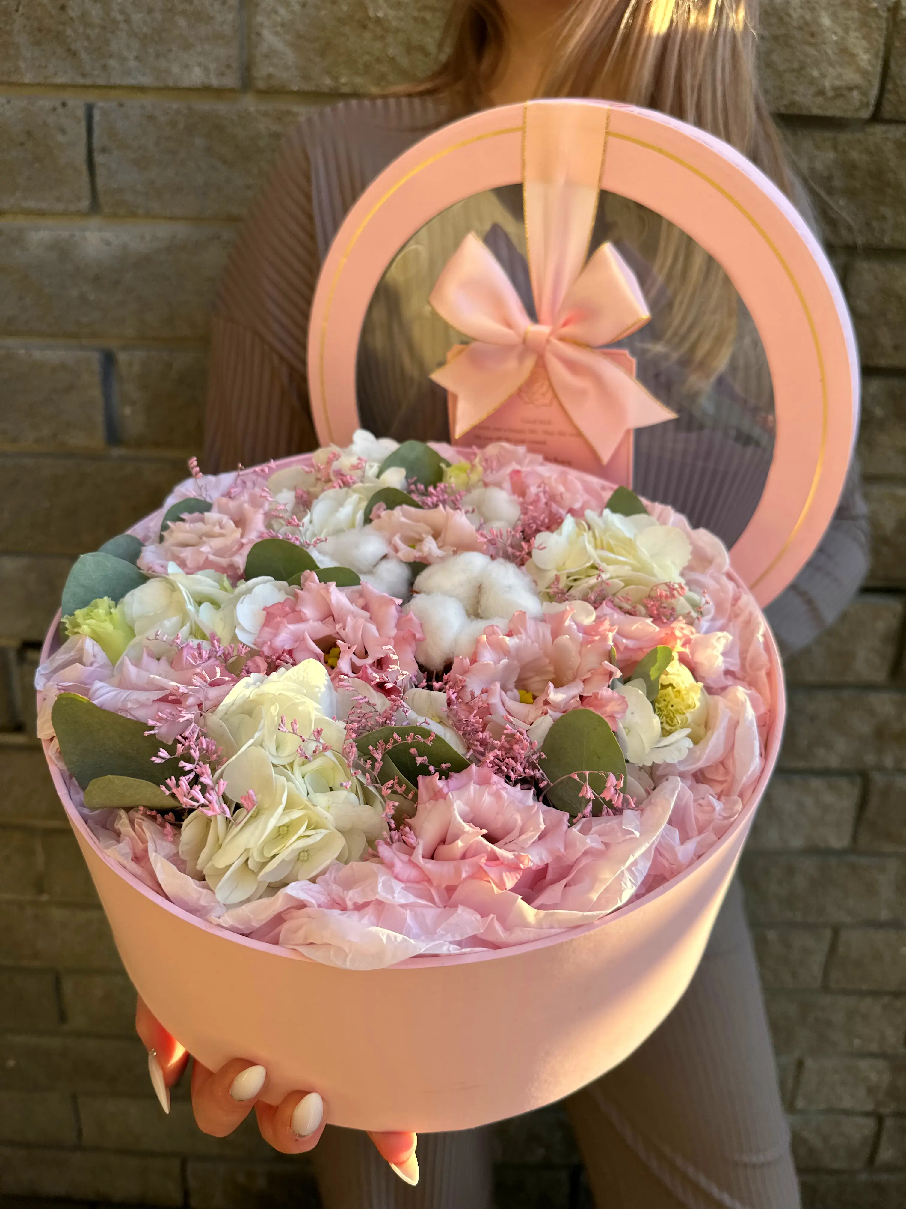 Шляпная коробка с эустомой и гортензией — купить по цене от 3875 руб. с доставкой в Нижнем Новгороде