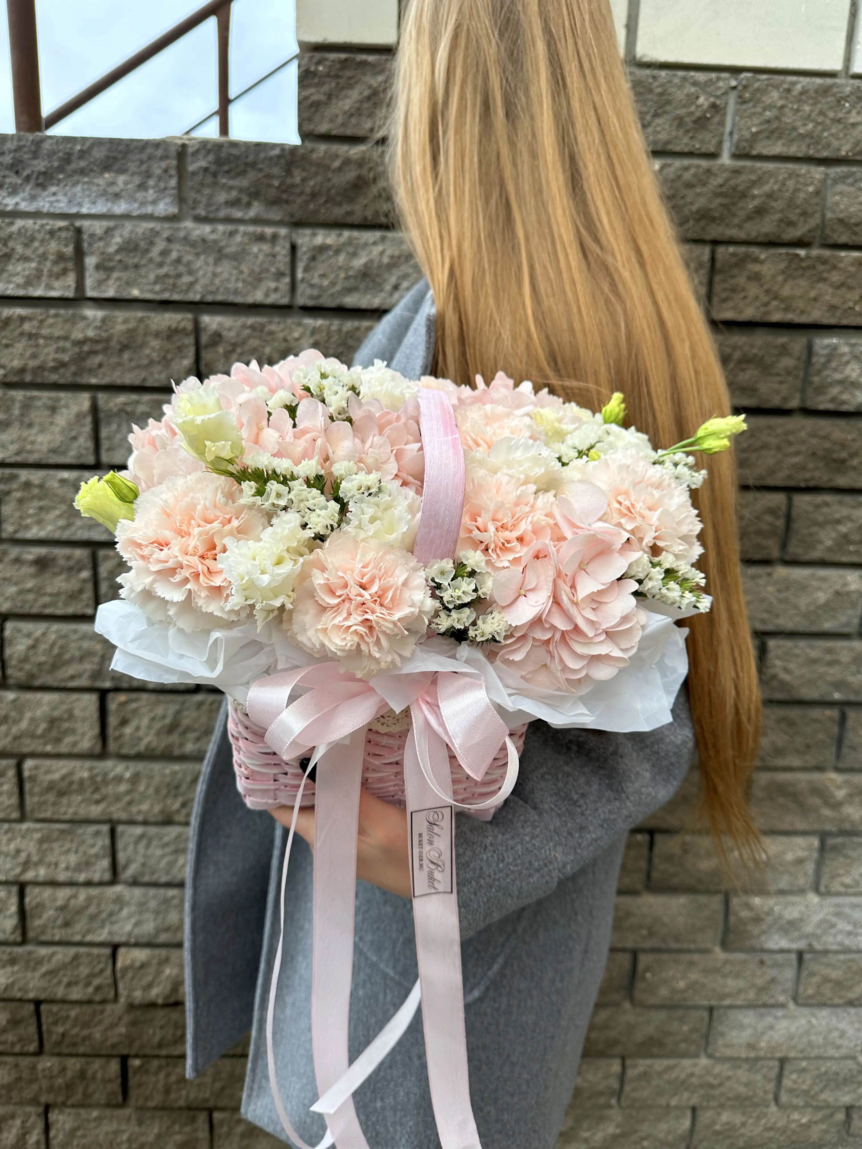 Корзина средняя с гвоздикой и гортензией — купить с доставкой в Нижнем Новгороде
