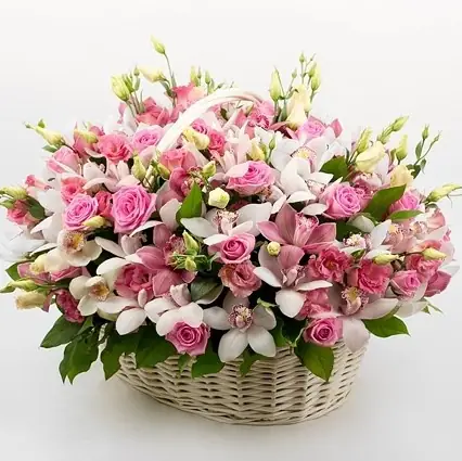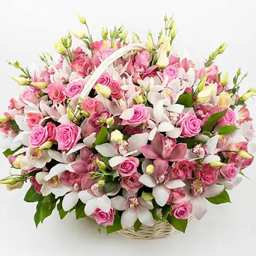 Невероятной красоты и нежности корзина с орхидеями, которые очень удачно дополнены лизиантусом и розами. Эта композиция предназначена, чтобы восхитить и остаться в памяти на всю жизнь.