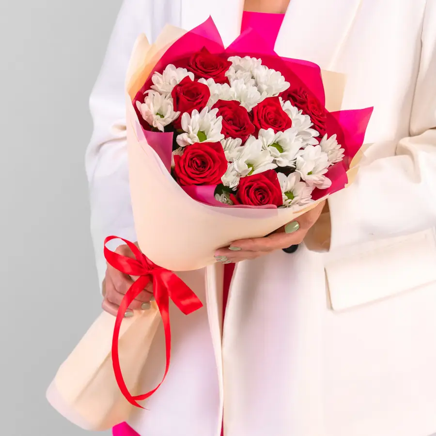Букет из красных роз и белых хризантем — купить по цене от 4040 руб. с доставкой в Нижнем Новгороде