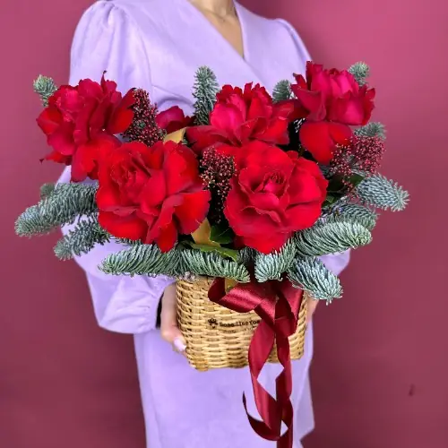Зимняя корзина с розами — купить по цене от 3383 руб. с доставкой в Нижнем Новгороде