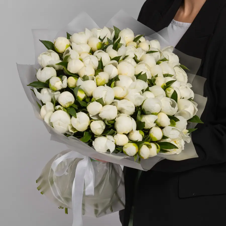51 Белый Пион в упаковке — отличный выбор для подарка! На сайте вы найдете красочные фотографии, которые помогут сделать выбор. Цена букета — 42410 руб.. Закажите 51 Белый Пион в упаковке с доставкой в Нижнем Новгороде и по области.