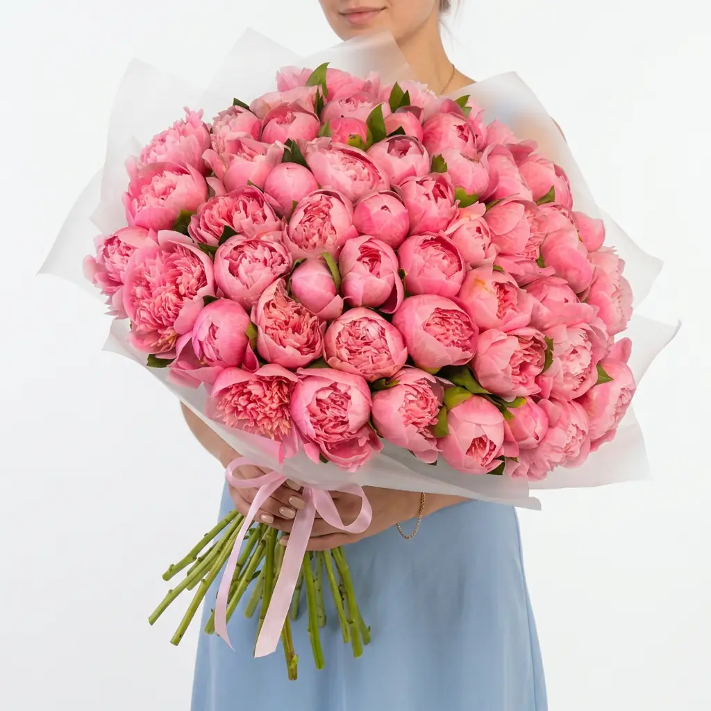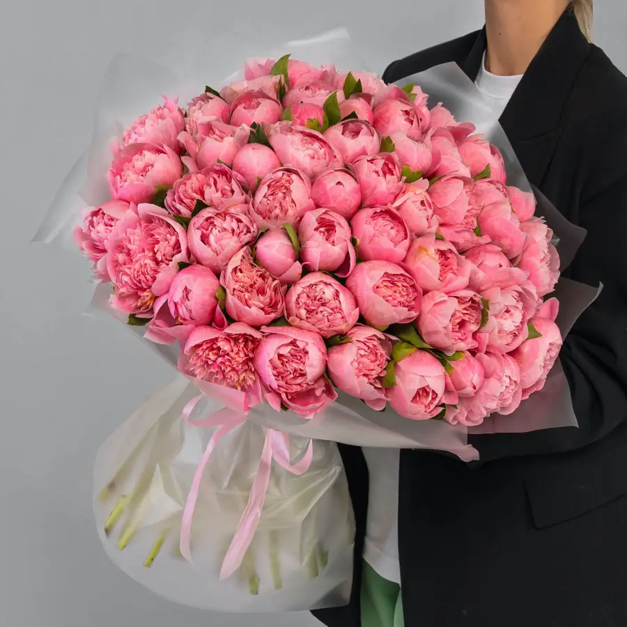 Букет из 51 пиона кораллового цвета в упаковке — купить по цене от 42410 руб. с доставкой в Нижнем Новгороде