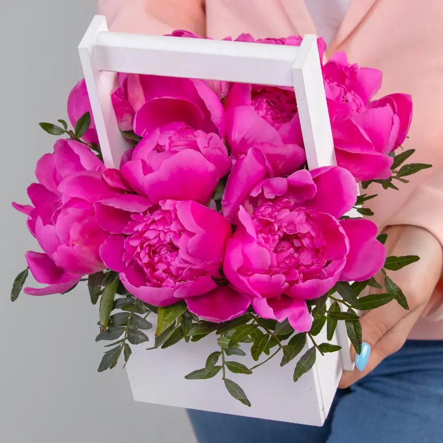 9 Малиновых Пионов в ящике — купить по цене от 9265 руб. с доставкой в Нижнем Новгороде