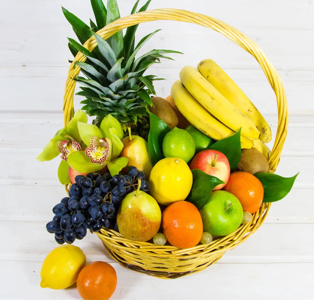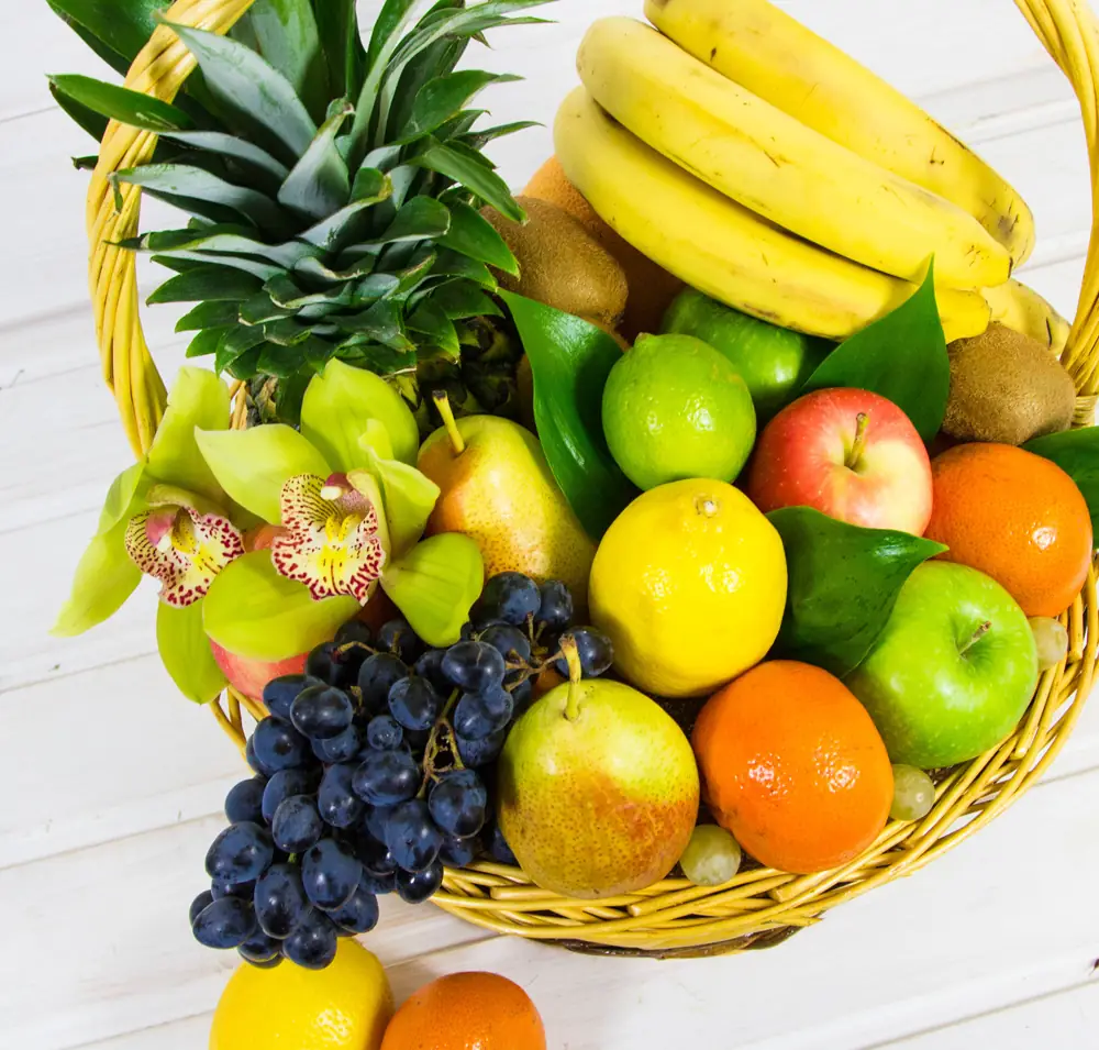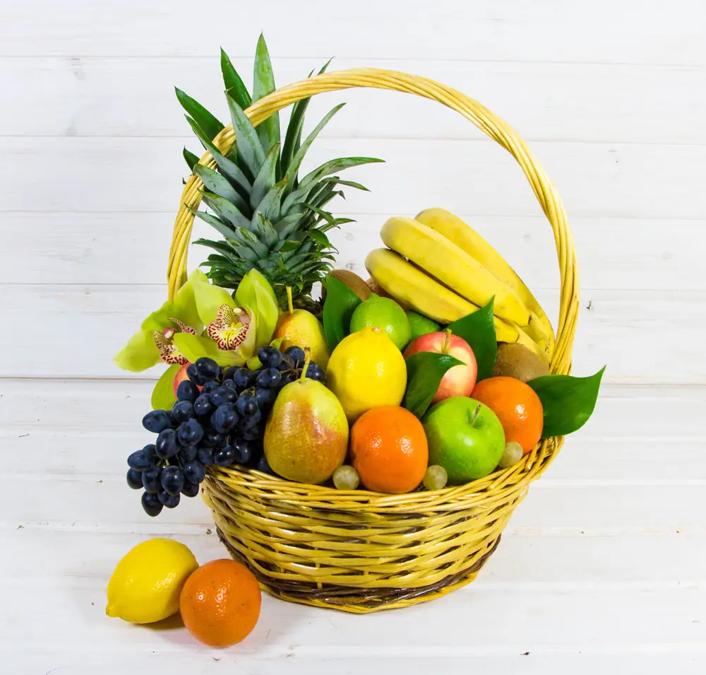 Фрукты красиво и со вкусом уложены в плетеную корзину и дополнены нежными цветками орхидеи цимбидиум.