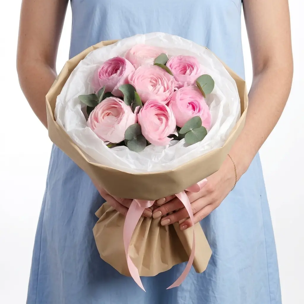7 Розовых ранункулюсов с эвкалиптом — купить по цене от 4870 руб. с доставкой в Нижнем Новгороде