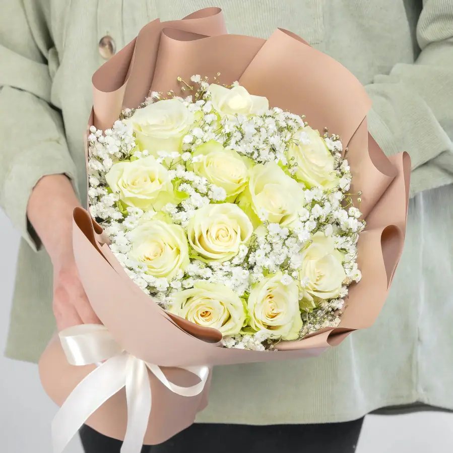 Букет из гипсофилы с розами отлично подойдет для любого повода - свадьба, день матери, 1 сентября, день учителя, юбилей, новый год, любимой на праздник 14 февраля.