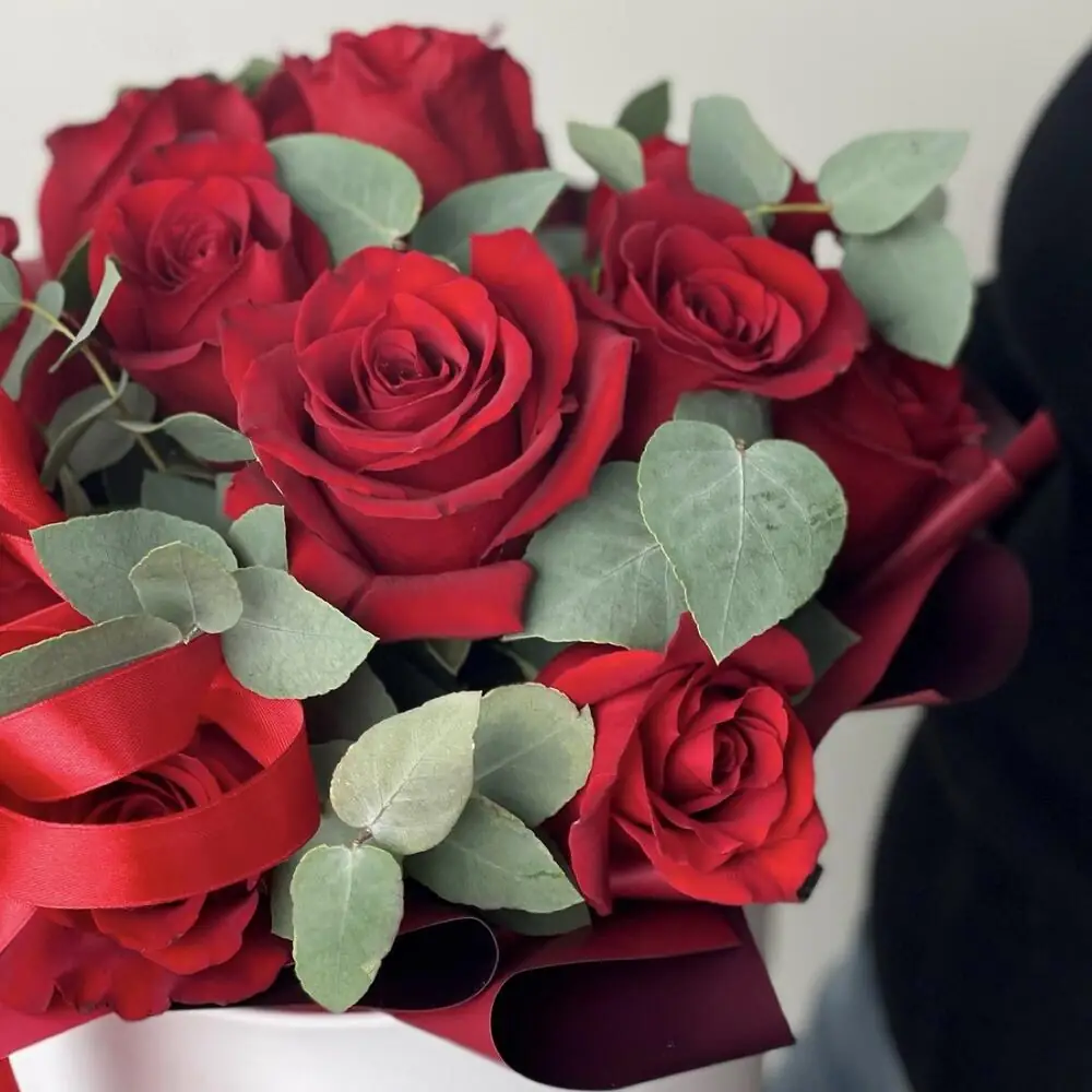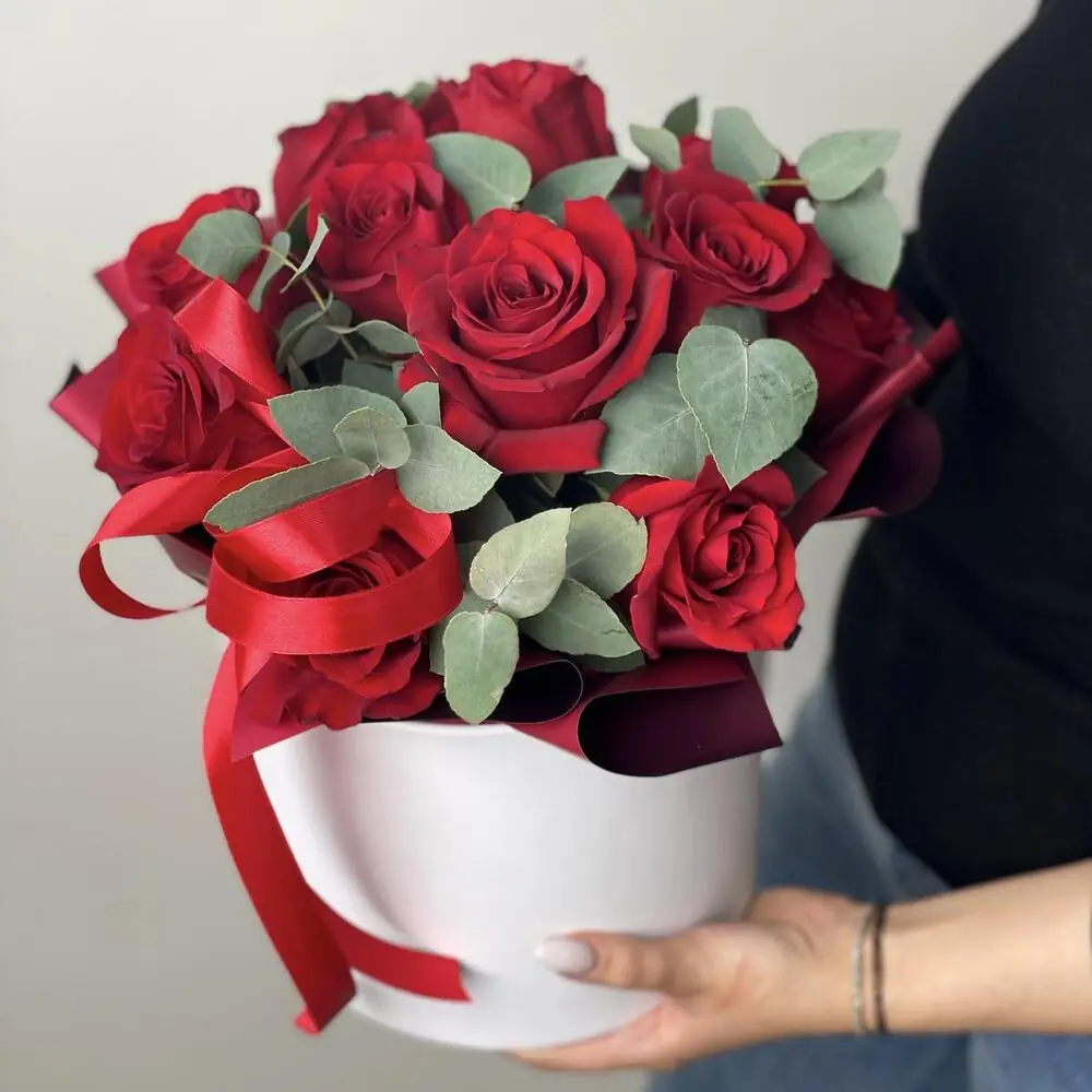 Красные розы в шляпной коробке и зелень — купить с доставкой в Нижнем Новгороде