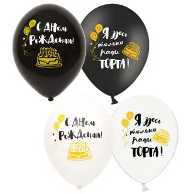 Ассорти шаров из натурального латекса черного и белого цвета с крупным односторонним шелкографическим рисунком "С Днем Рождения! Я здесь только ради торта!". Производитель – Belbal (Польша). Размер - 30 см.