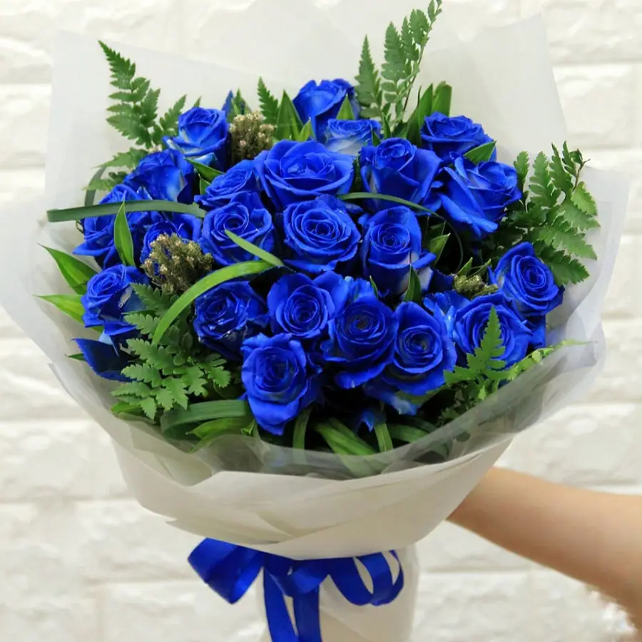 На фото - Синие розы в дизайнерской упаковке. В составе данной композиции: Роза - 23 шт, Зелень, Дизайнерская упаковка , Лента атласная , . На сайте sbuket-nn.ru Вы найдете большой выбор недорогих букетов, цветочных композиций для любого повода. У нас можно заказать Синие розы в дизайнерской упаковке за 10800 руб.